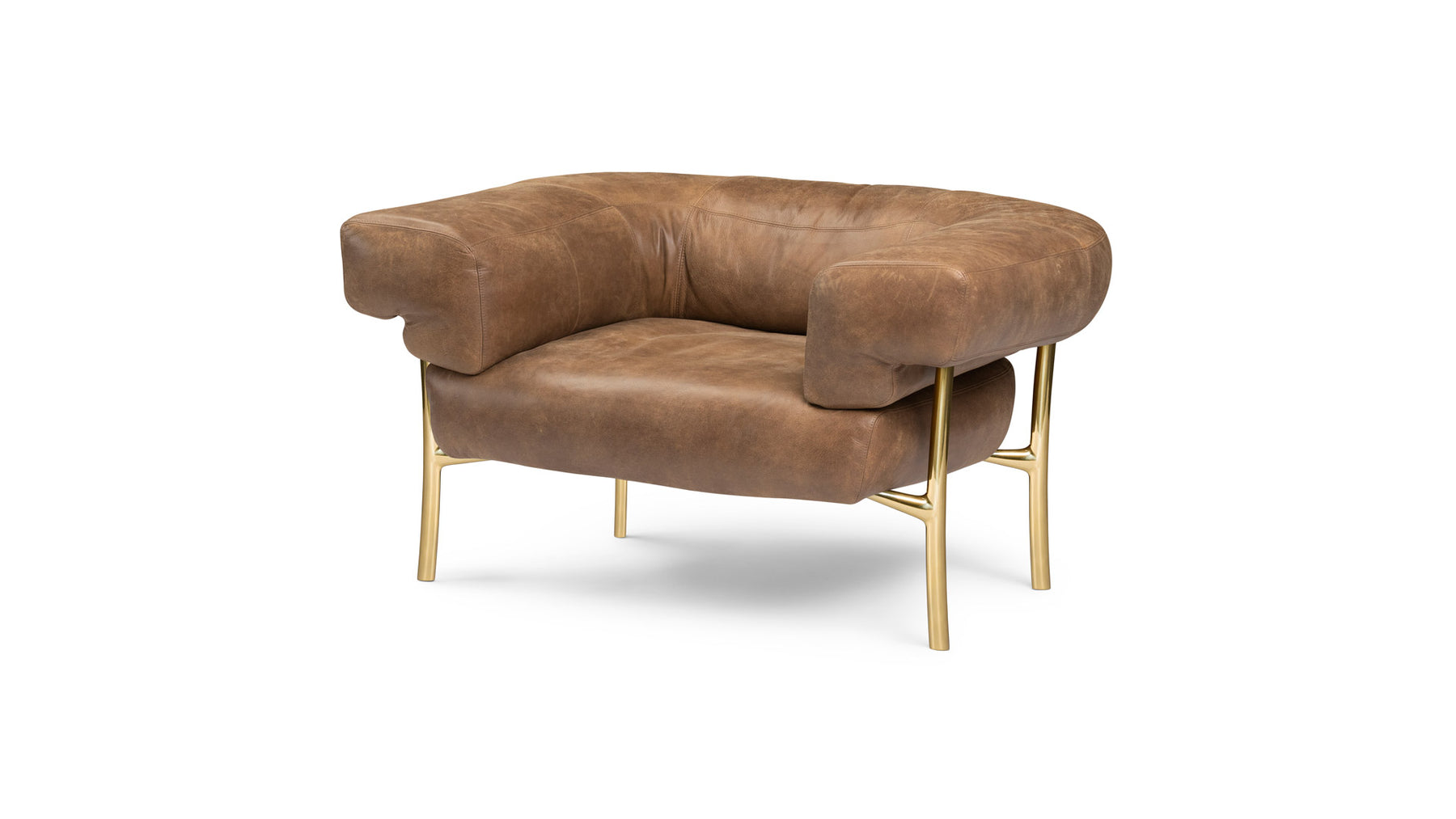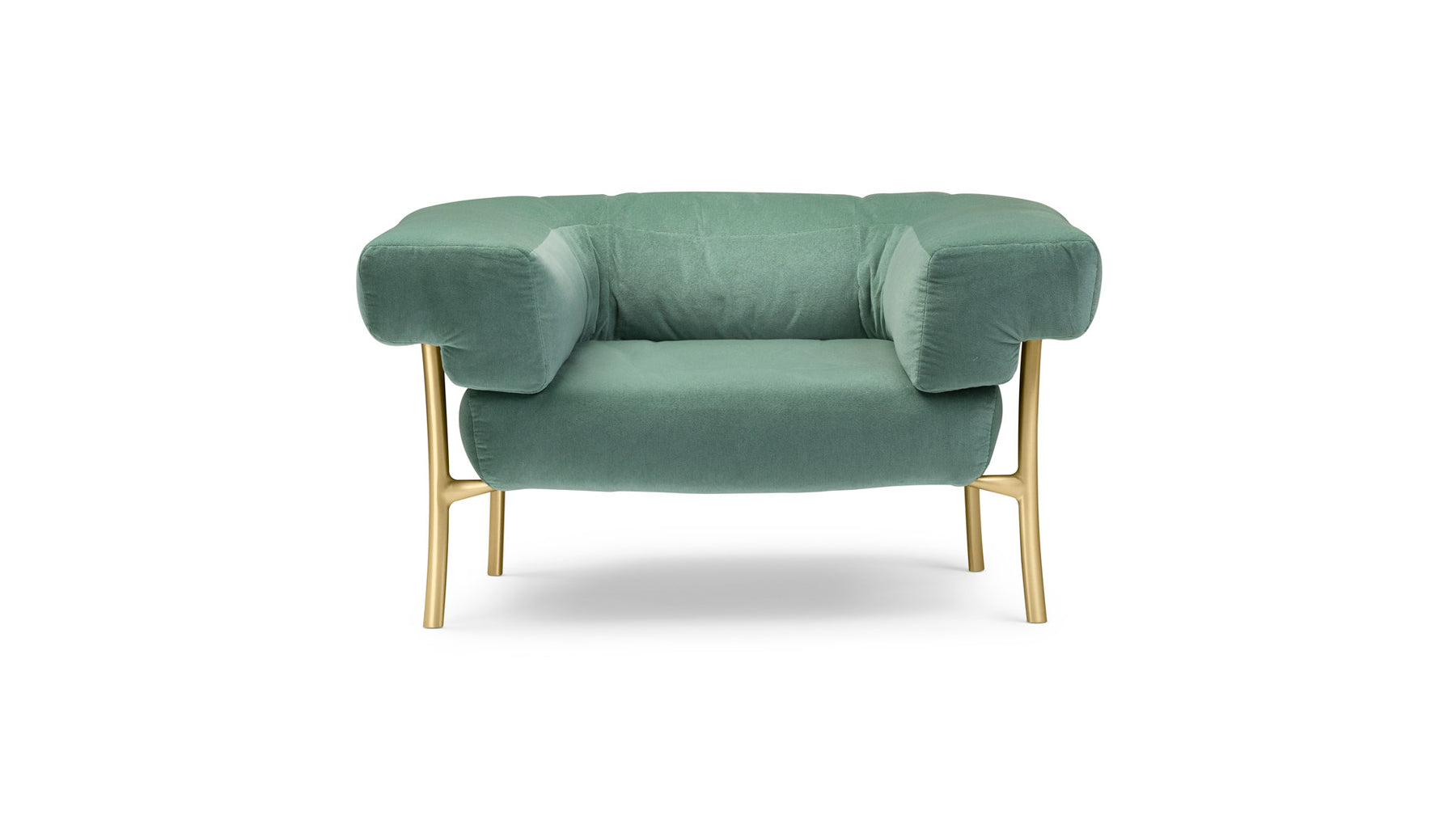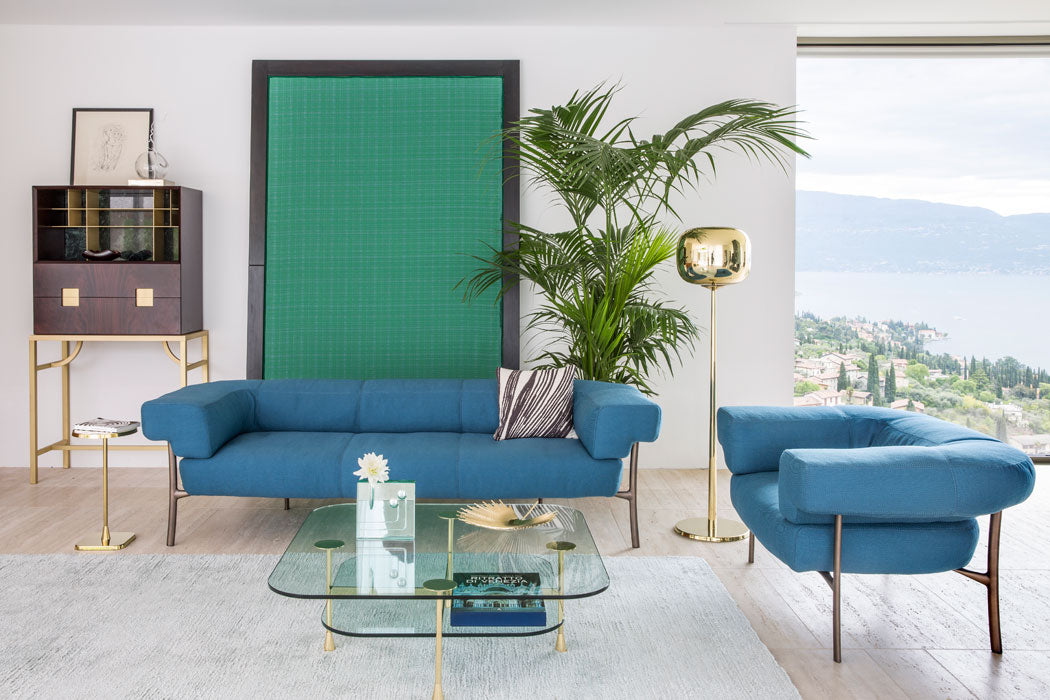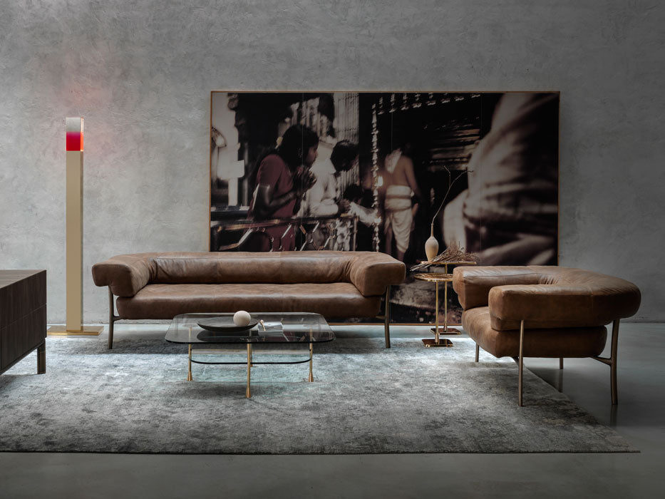 The sofa and armchair is based on the Katana leg. The Katana leg is made of Italian brass, die casted in-house at Ghidini1961. Polished manually, and lacquered with transparent finish to guarantee a longlasting durability.