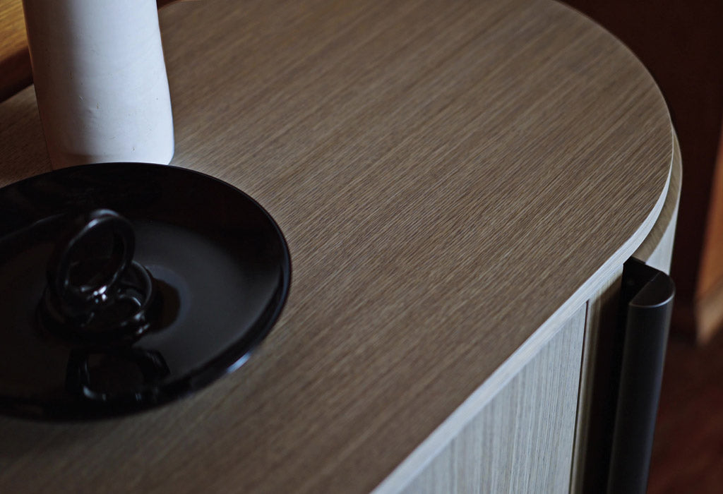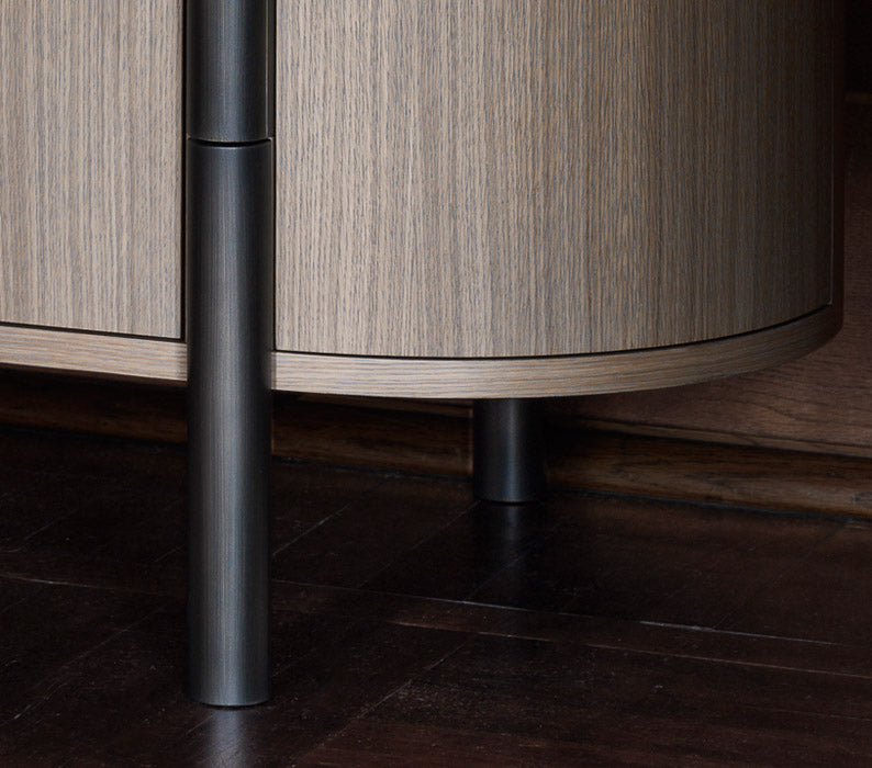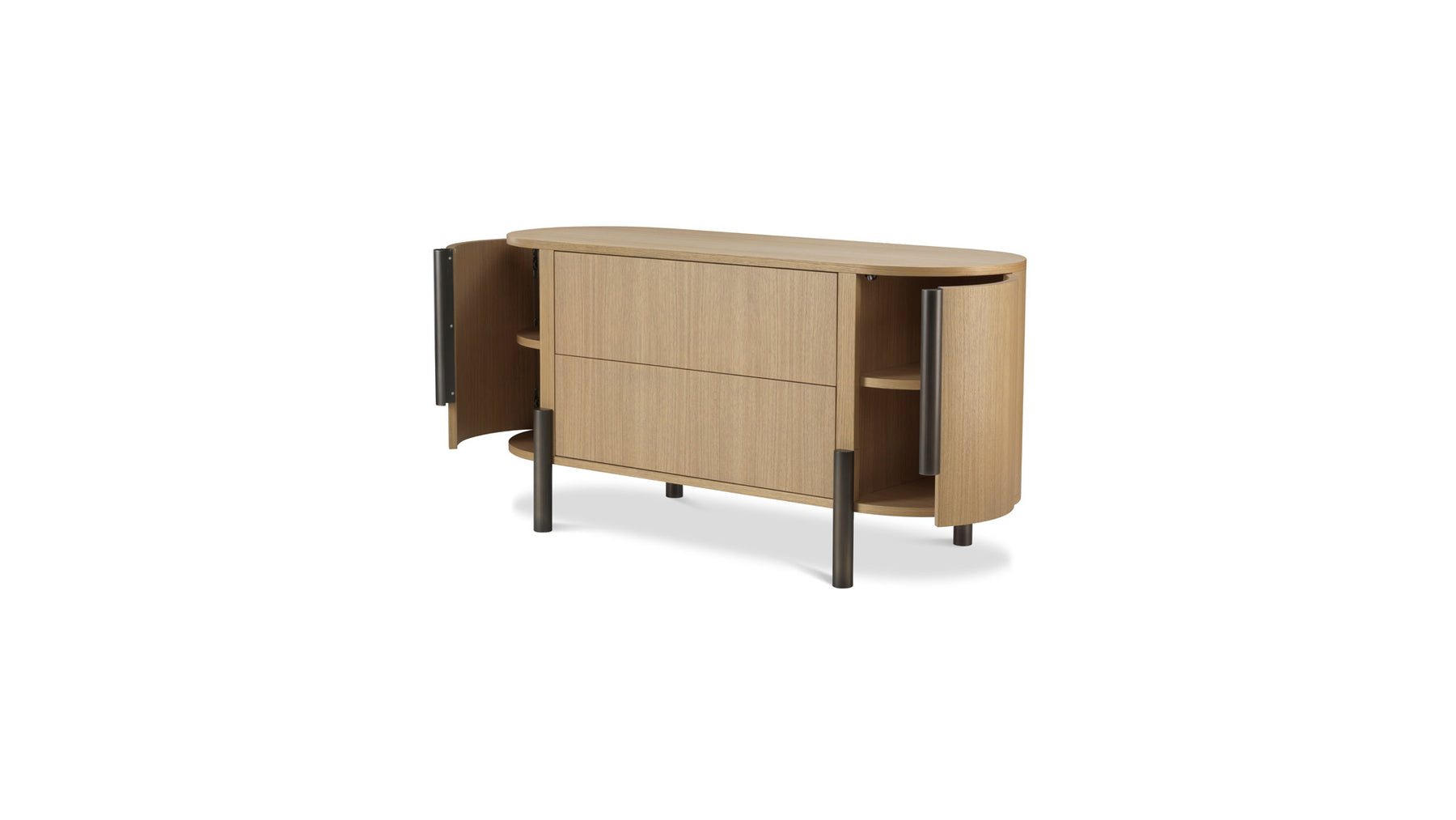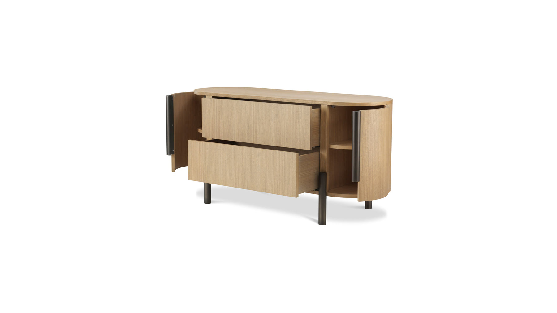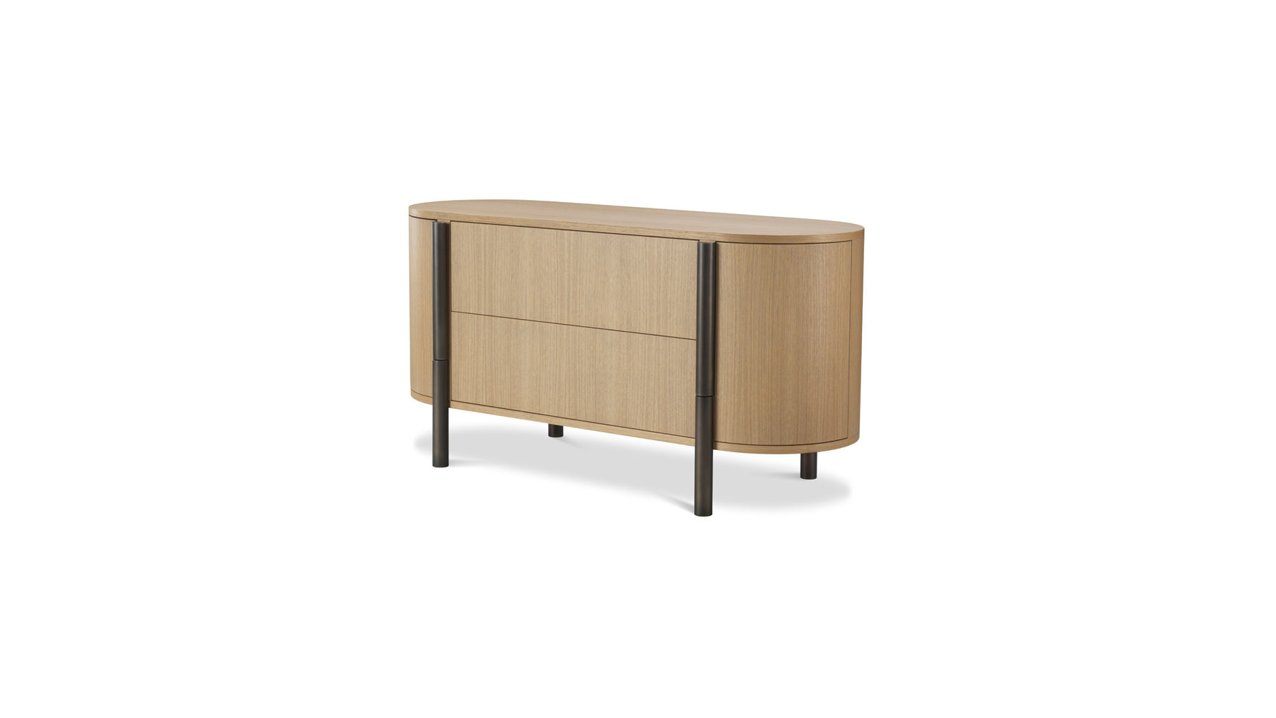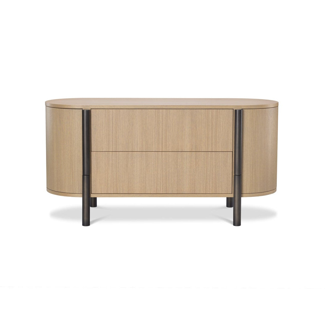 The Chest is a bed cabinet in oak with large front drawers and curved side doors.