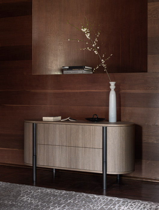 The Tarantino chest of drawers and bedside table feature curved and delicate lines that reference those of the bed, which they complement naturally.