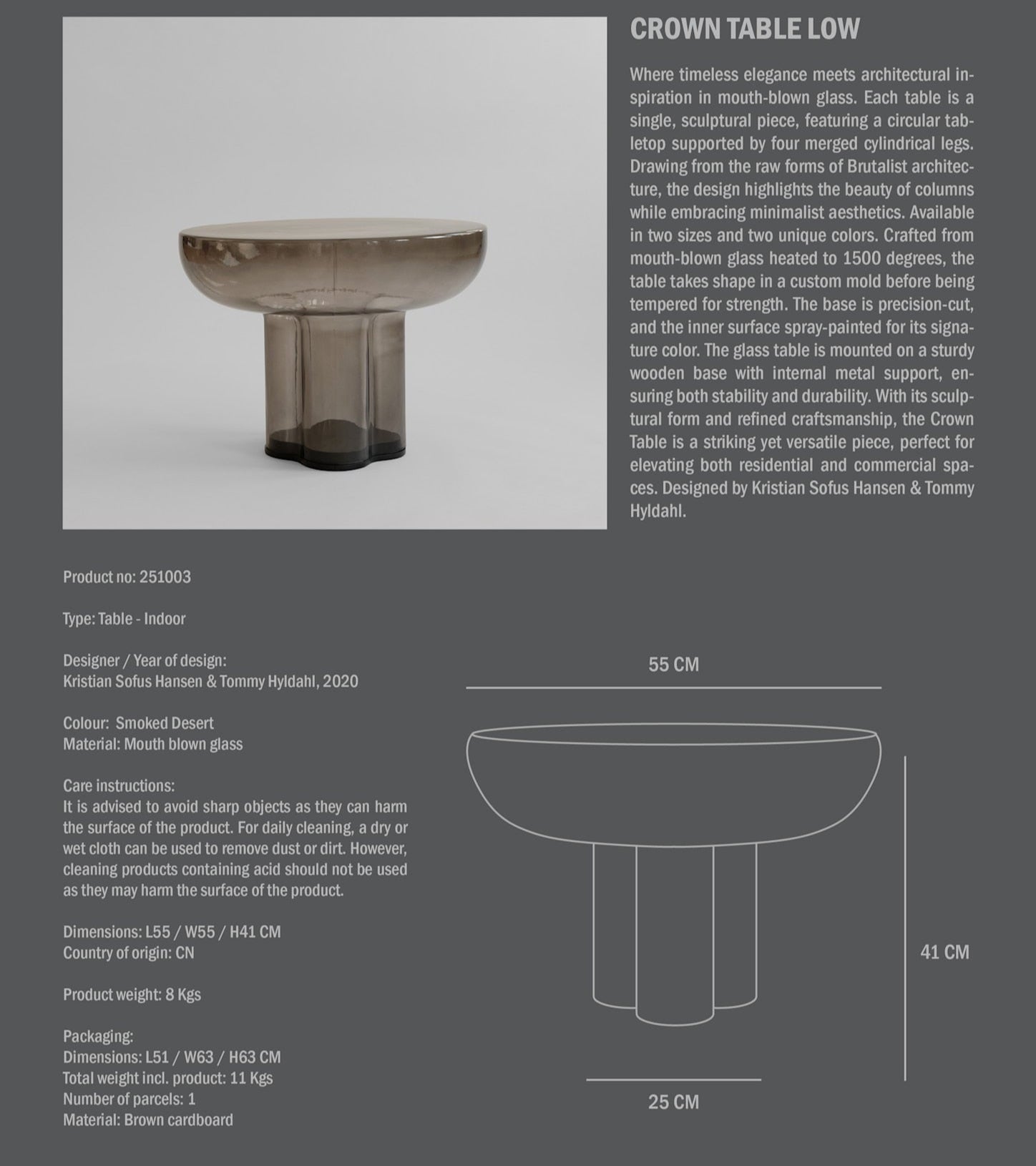 Where timeless elegance meets architectural inspiration in mouth-blown glass. Each table is a single, sculptural piece, featuring a circular tabletop supported by four merged cylindrical legs. Drawing from the raw forms of Brutalist architecture, the design highlights the beauty of columns while embracing minimalist aesthetics. Available in two sizes and two unique colors. Crafted from mouth-blown glass heated to 1500 degrees, the table takes shape in a custom mold before being tempered for strength. The base is precision-cut, and the inner surface spray-painted for its signature color. The glass table is mounted on a sturdy wooden base with internal metal support, ensuring both stability and durability. With its sculptural form and refined craftsmanship, the Crown Table is a striking yet versatile piece, perfect for elevating both residential and commercial spaces.