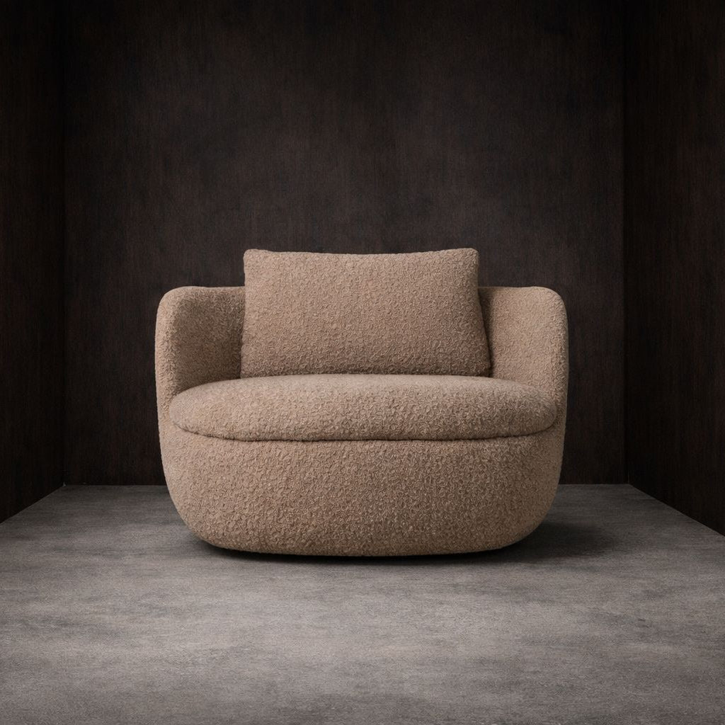 Built on a solid wooden frame, the armchair features generous padding in foam and Dacron, complemented by a foam seat that ensures a soft and supportive seating experience. The swivel base adds a functional touch, enhancing versatility and ease of movement.