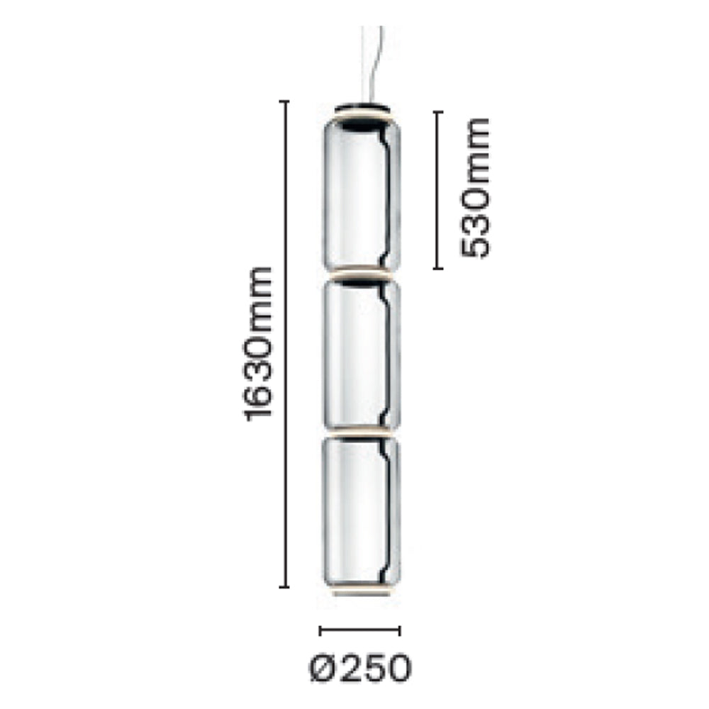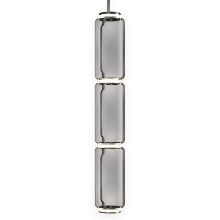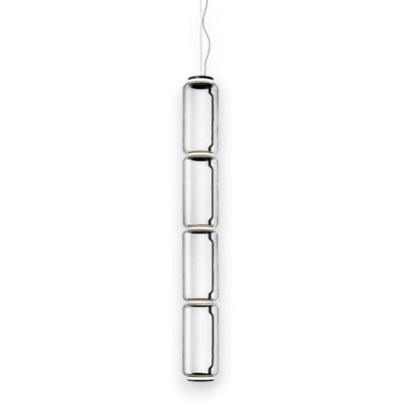 This distinctive suspension lamp by renowned designer Konstantin Grcic brings together industrial precision and delicate craftsmanship. The design features a vertically aligned structure composed of cylindrical modules in transparent blown glass, each joined by die-cast aluminium rings and sophisticated suspension fittings.