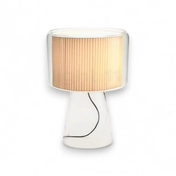 The Mercer table lamp, designed by Giovanna Gaspare for the Marset collection, is an elegant fusion of simplicity and material harmony. Its transparent blown glass structure gracefully envelops the inner fabric shade, which appears to float within, creating a captivating interplay of lightness and refinement.