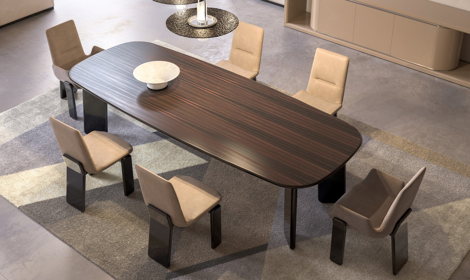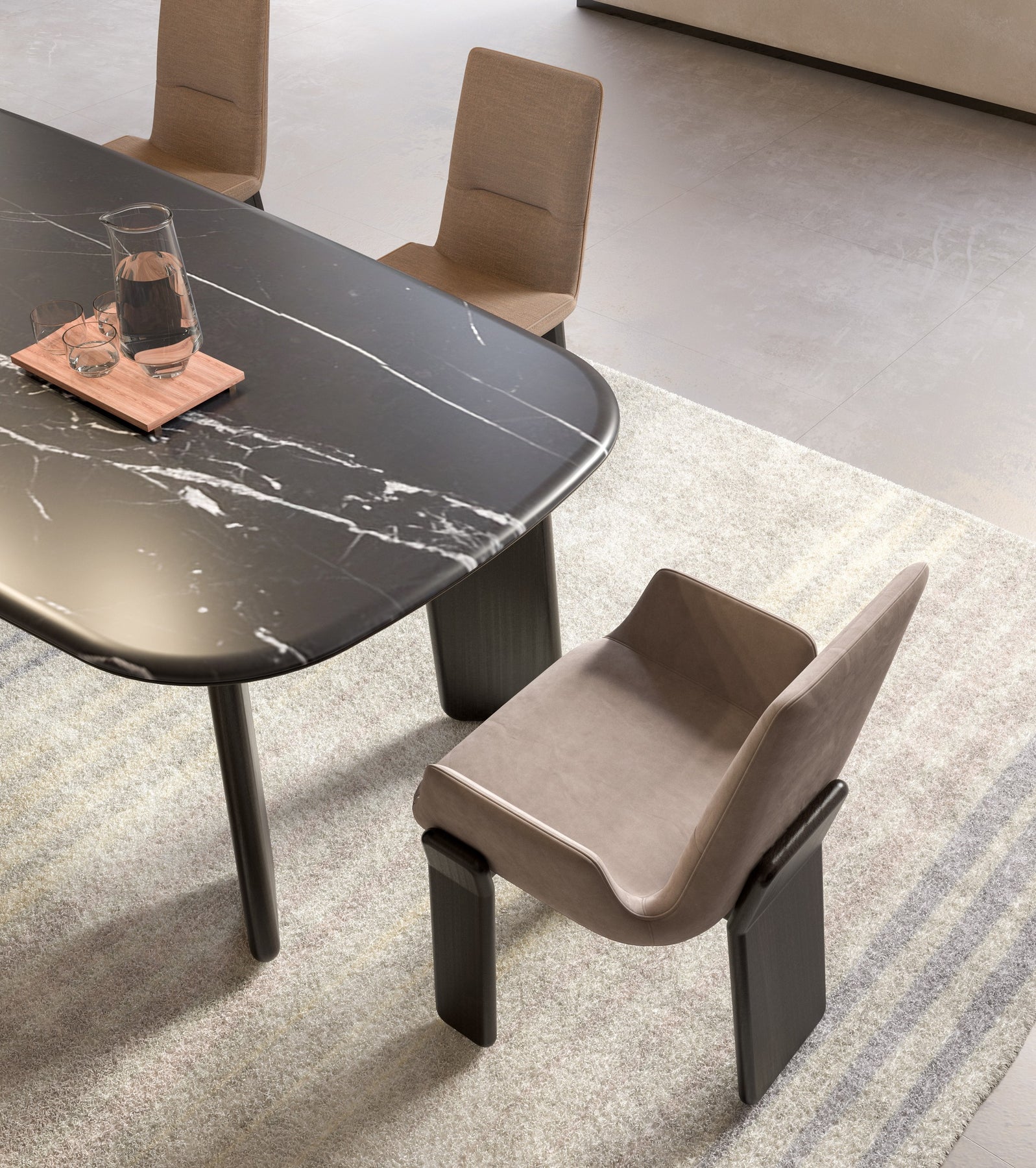 Available in different sizes. Rectangular dining table with a wooden base and marble top.