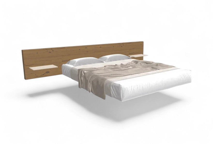 This version includes a headboard in Wildwood Natural finish, a mattress platform, and two hanging night shelves in glossy glass lacquered in Jute. Subtle LED lighting under the footboard and at the headboard enhances the floating effect and adds a soft ambient glow.