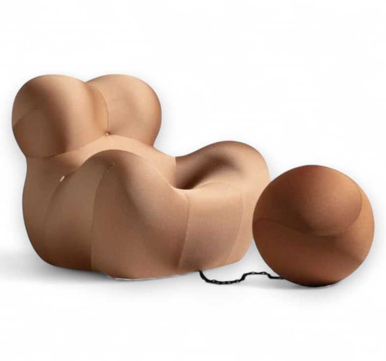 The armchair is paired with a striking bronze-colored spherical pouf, connected by an aluminium chain with a corten finish, reinforcing its sculptural presence.