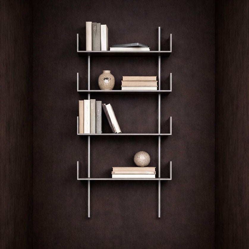 This elegant bookcase is defined by a refined balance of materials and vertical proportions. The satin nickel-plated brass uprights give the structure a luminous, architectural presence, while the black stained ash shelves add depth and visual contrast.