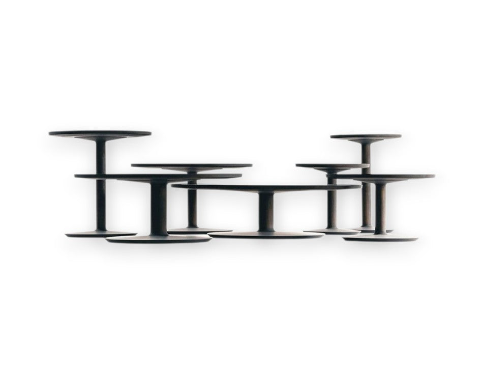 Crafted from solid oak, the tabletop features a subtle curvature that enhances its organic and timeless appeal. Available in multiple heights and dimensions, these tables can be arranged in series, creating a dynamic flow where pieces seem to overlap, forming a seamless connection.