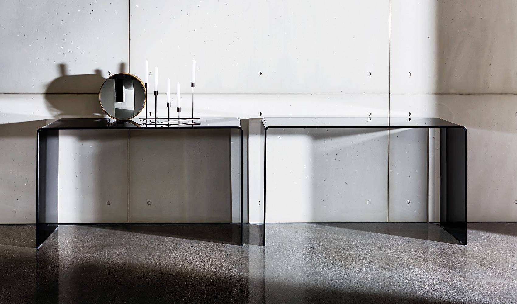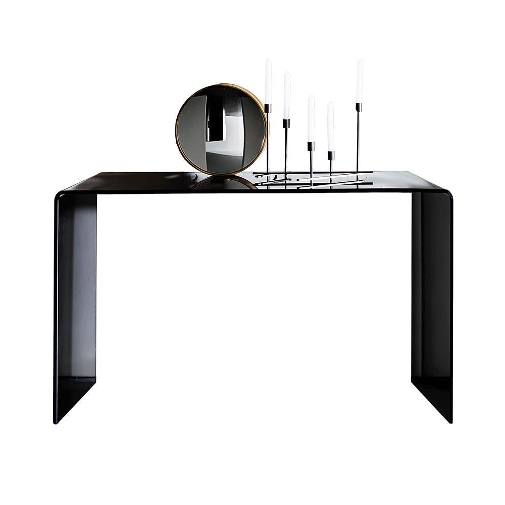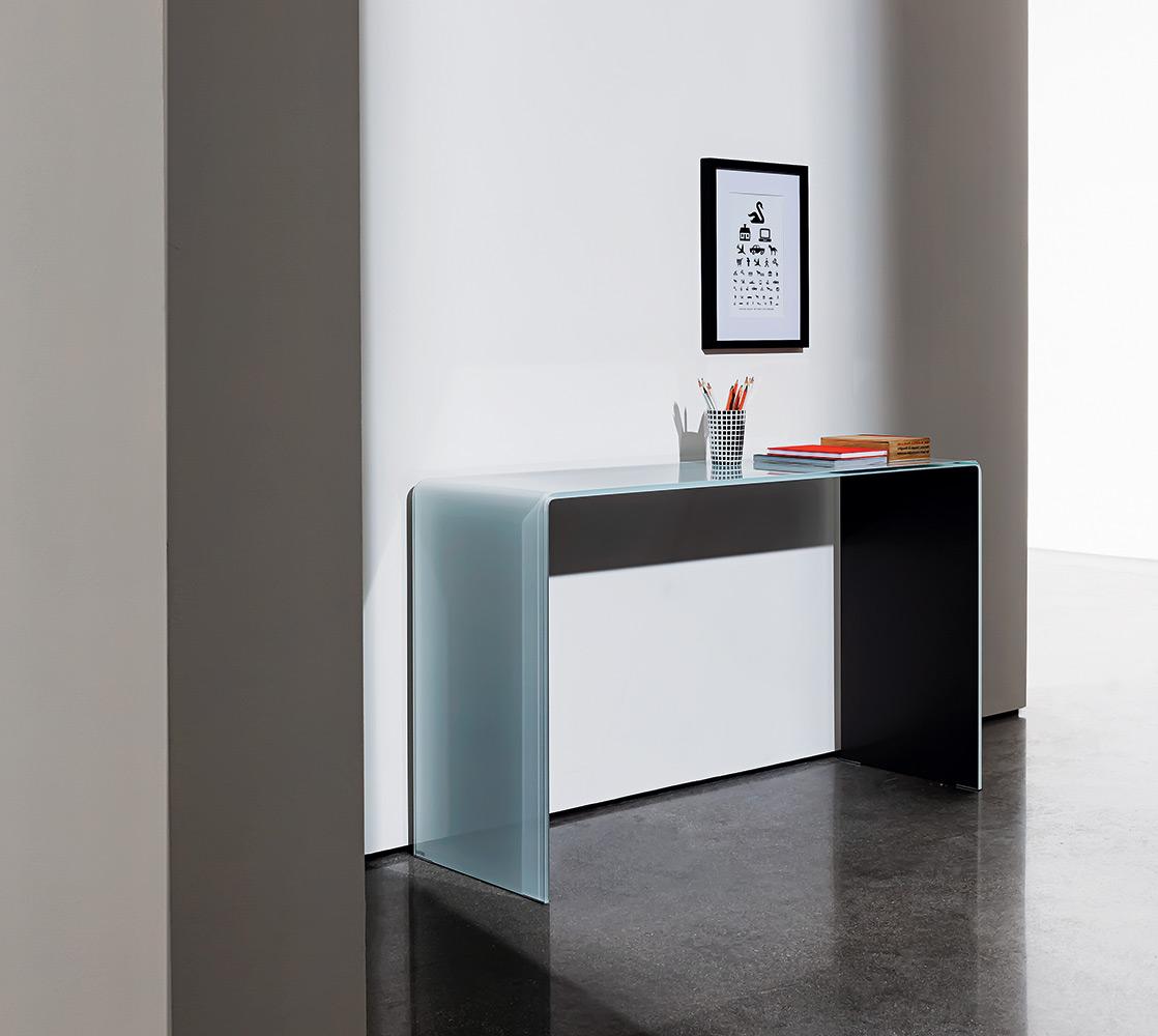 Console in bent glass extralight, smoked or lacquered mono or two-tones. Available also with glass shelf.