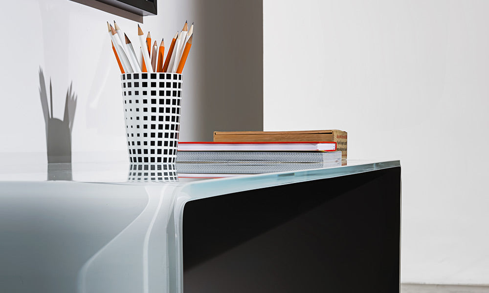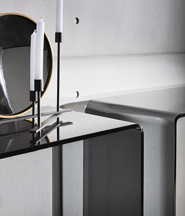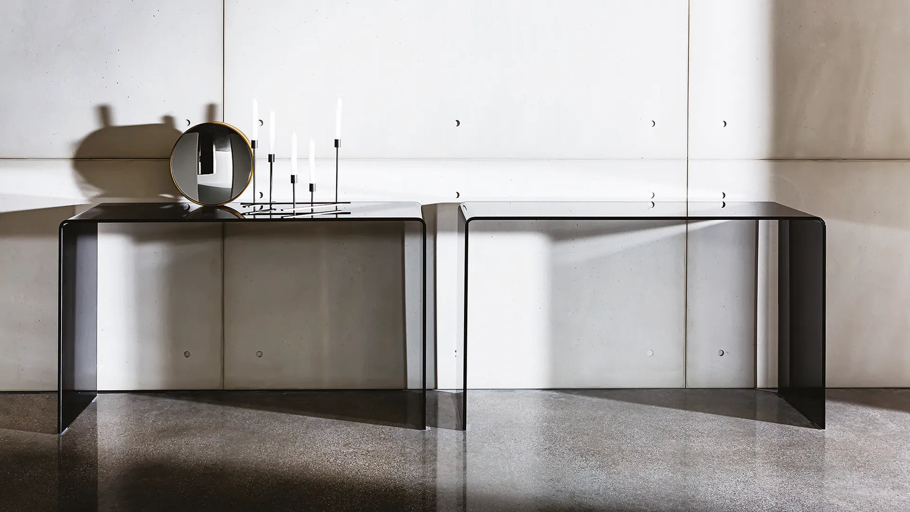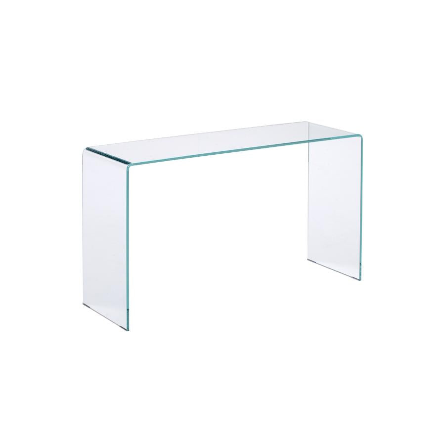 Console in bent glass extralight, smoked or lacquered mono or two-tones. Available also with glass shelf.