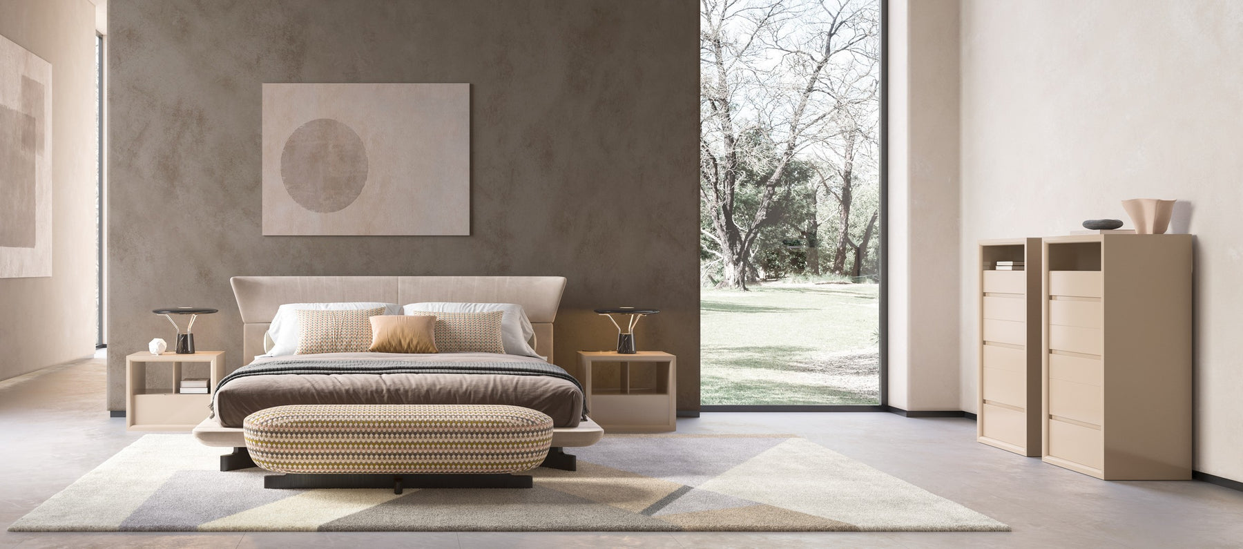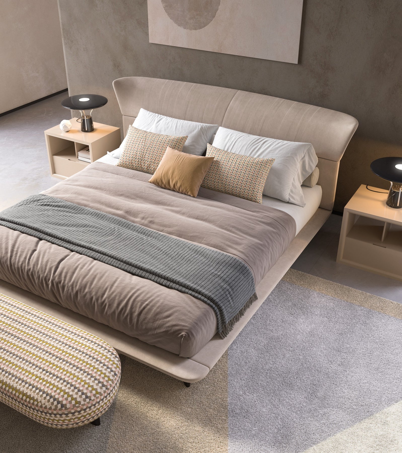 Bench upholstered in leather or fabric.