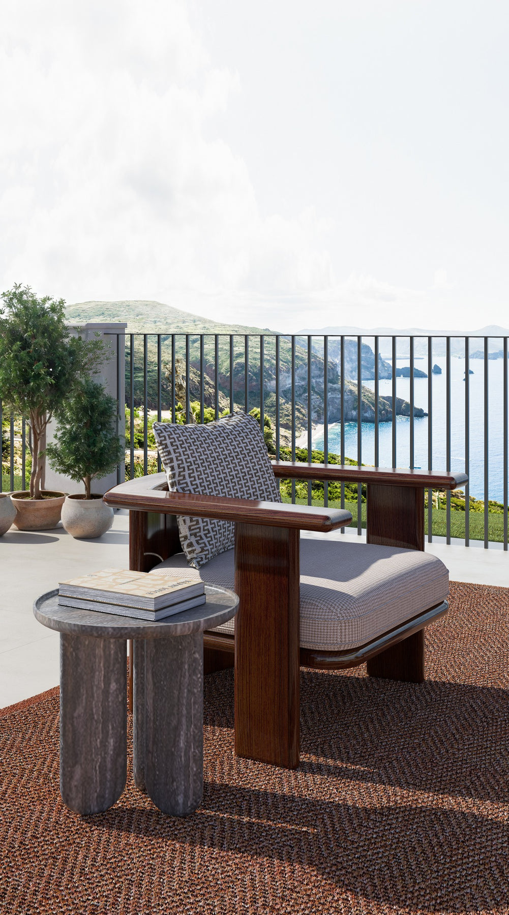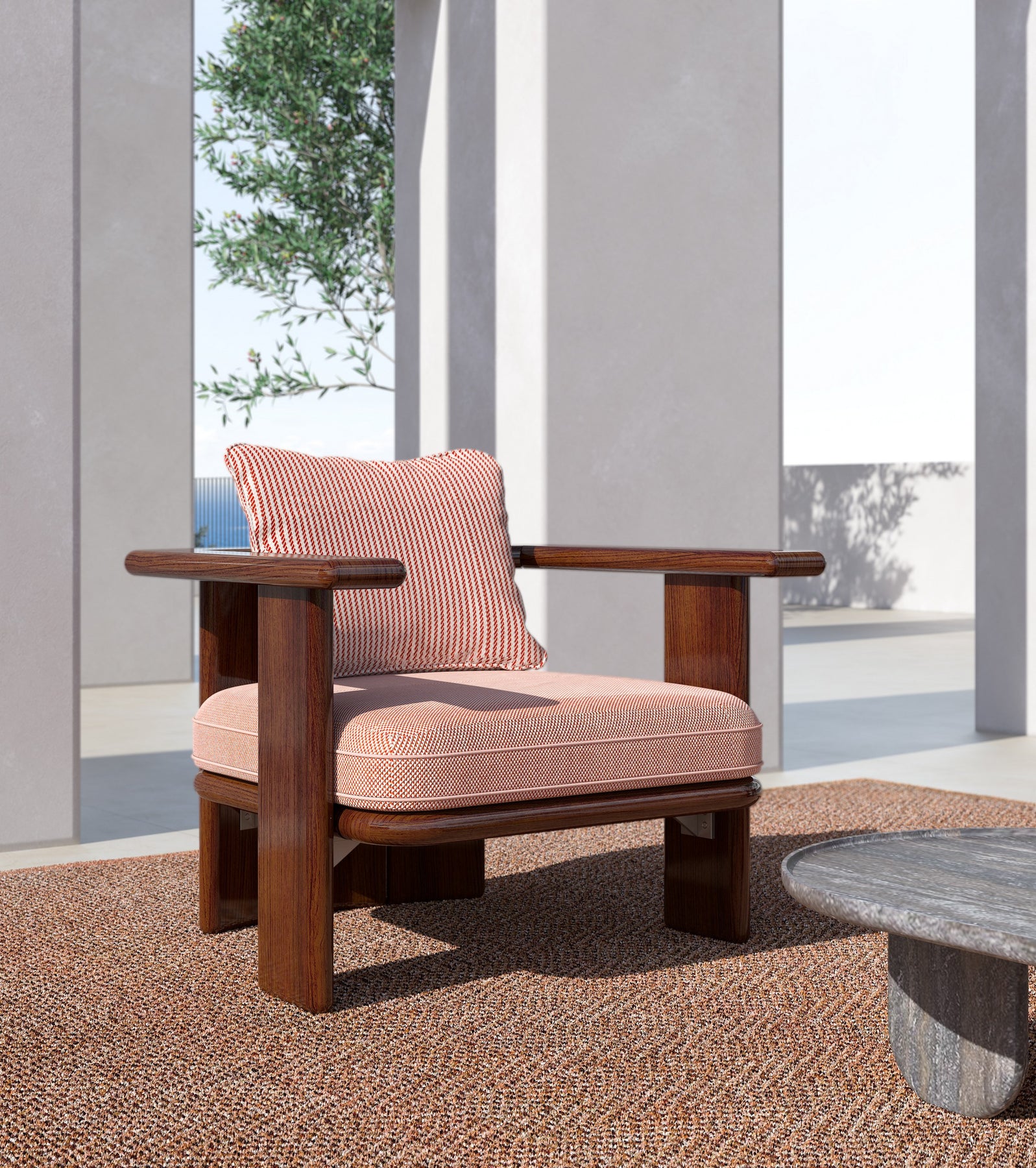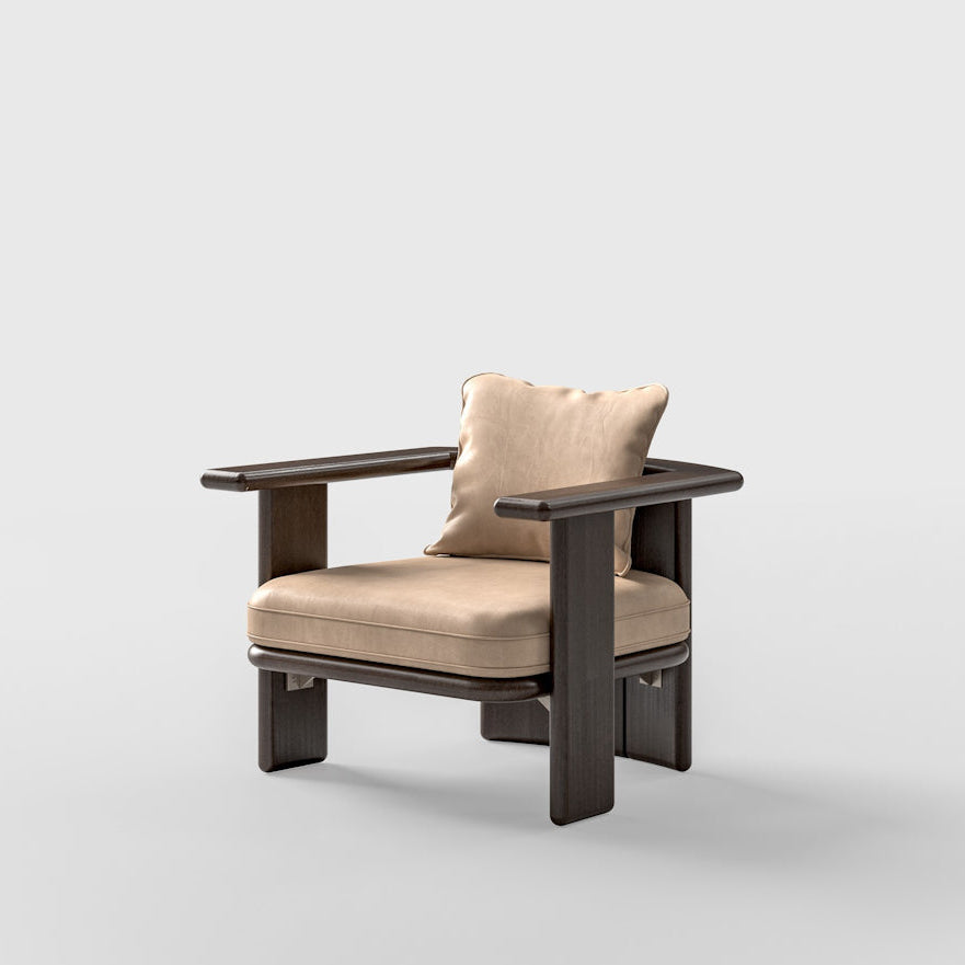 Armchair with a wooden base and upholstered in fabric.