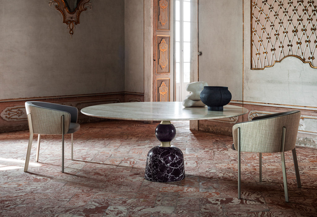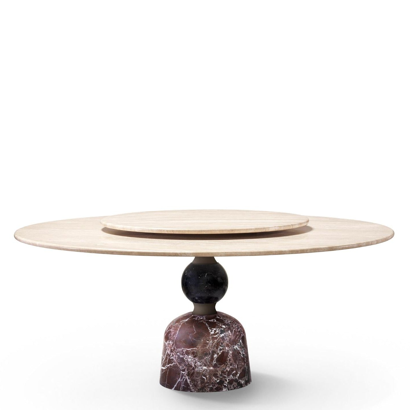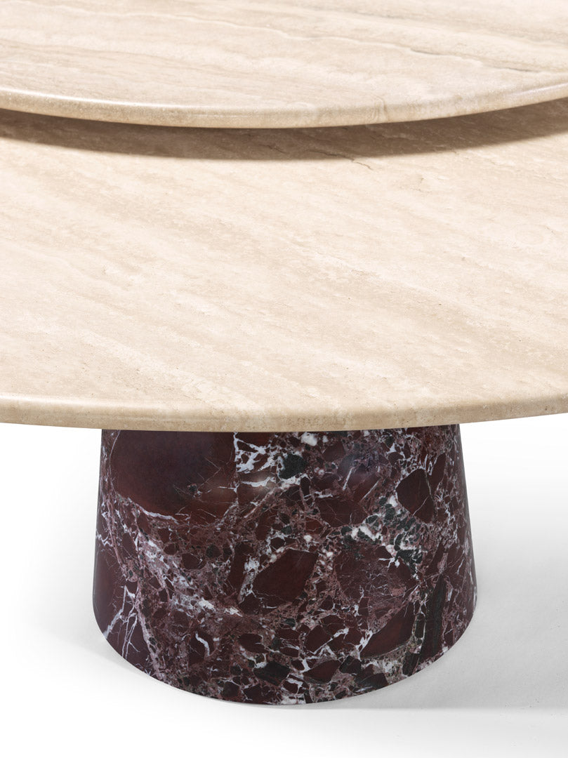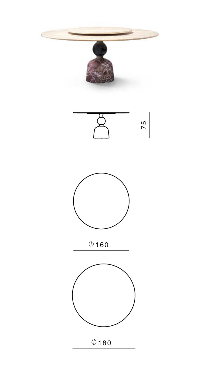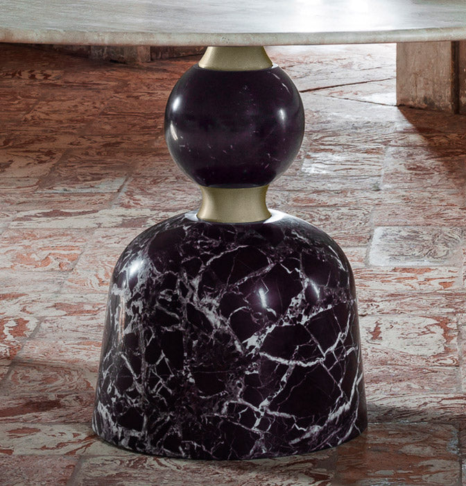The large circular top is well supported by a solid base formed by a series of overlapping concave and convex rotation volumes alternating the metal (brushed burnished metal scots) and stone (grooves and spheres in precious colored marbles).