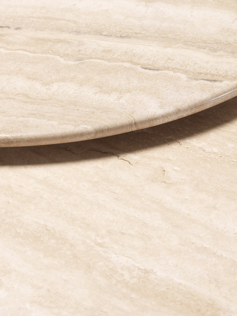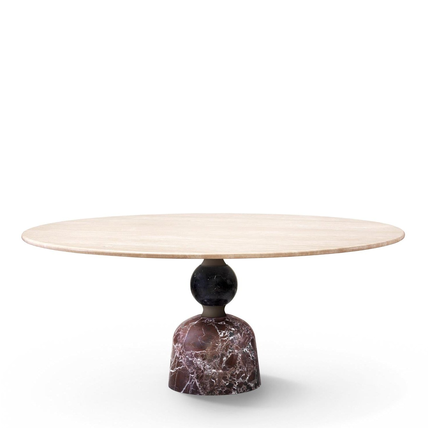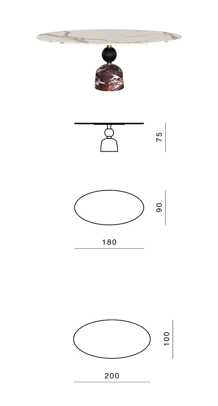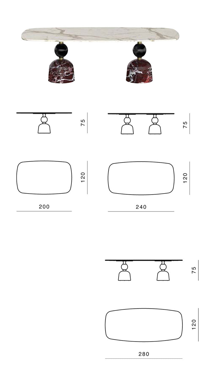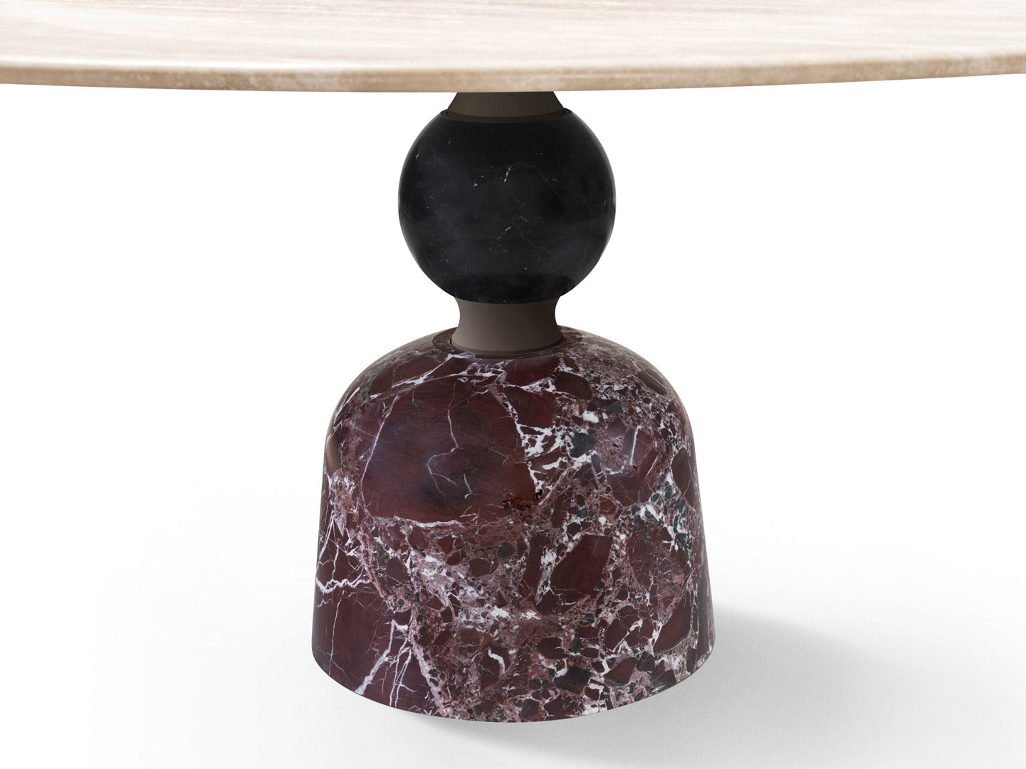 The large circular top is well supported by a solid base formed by a series of overlapping concave and convex rotation volumes alternating the metal (brushed burnished metal scots) and stone (grooves and spheres in precious colored marbles).