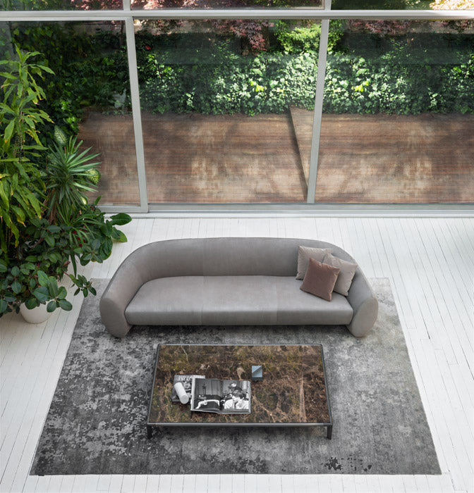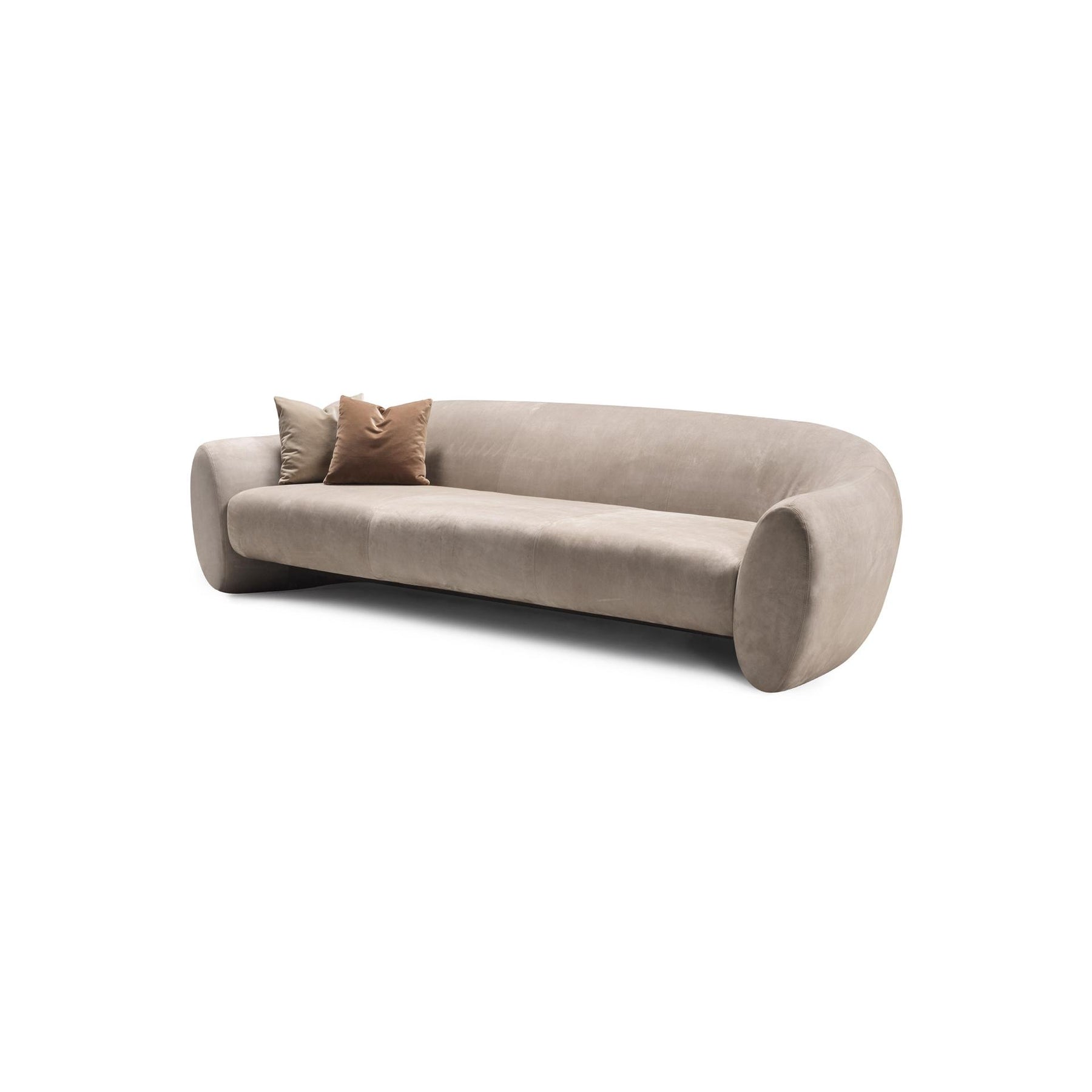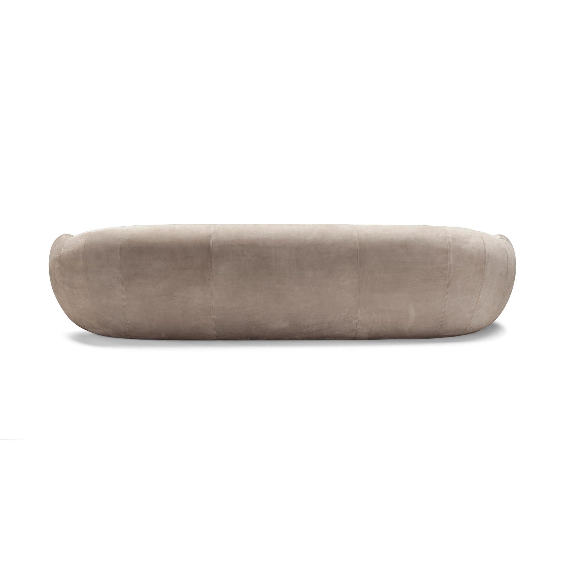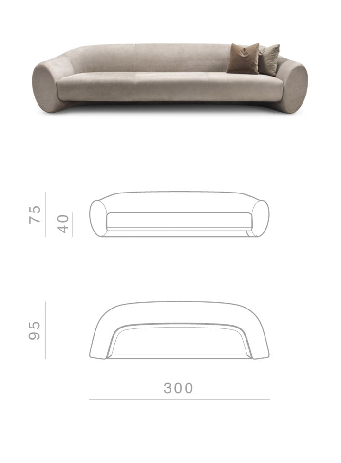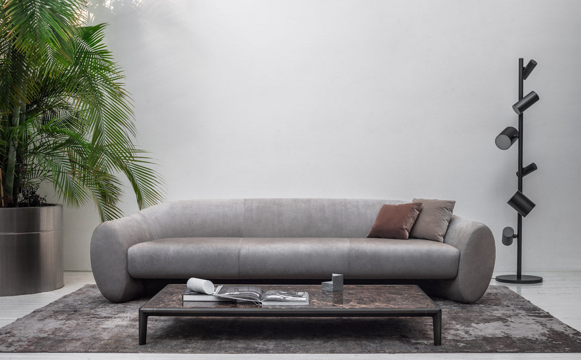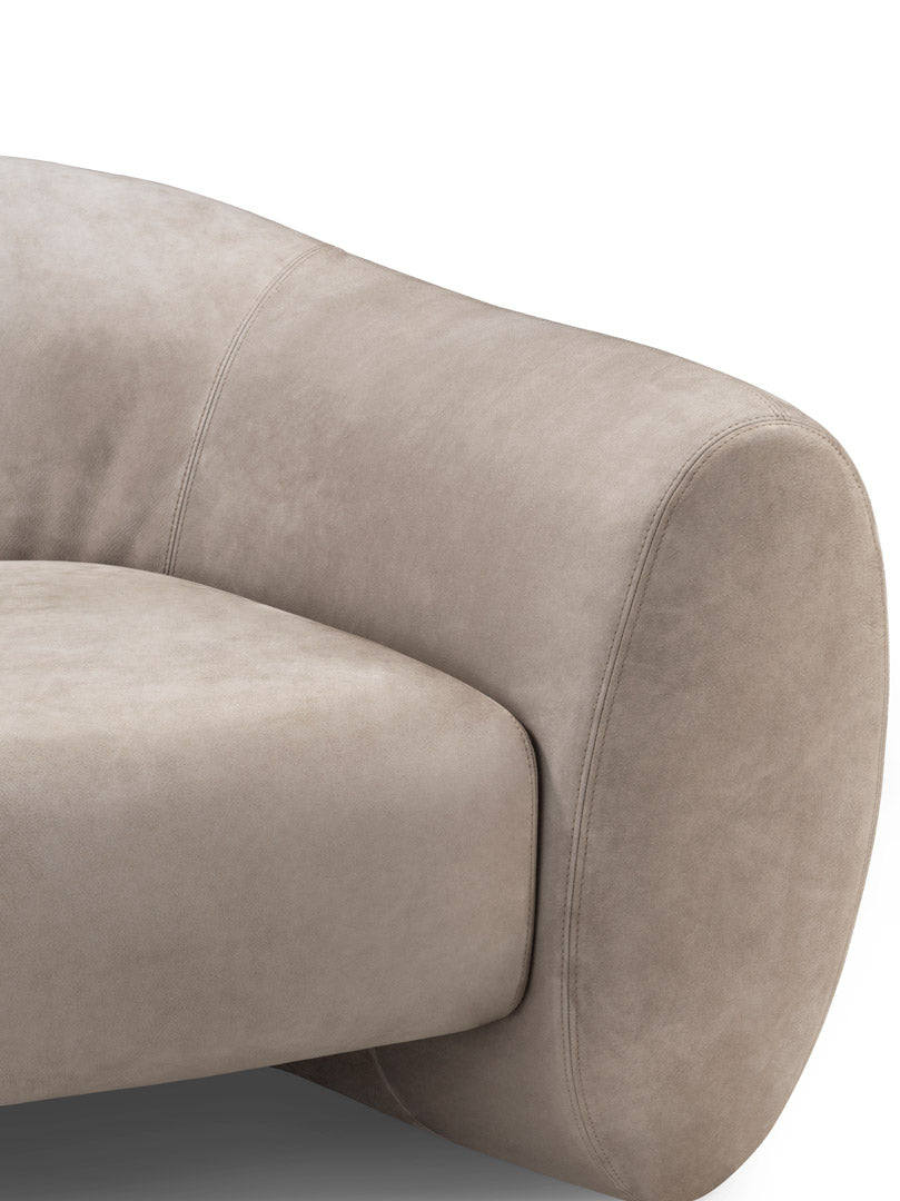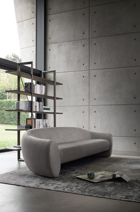 A large sofa characterized by a fluid movement that shapes the backrest with an elliptical section that opens by lowering to create the armrest.