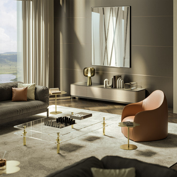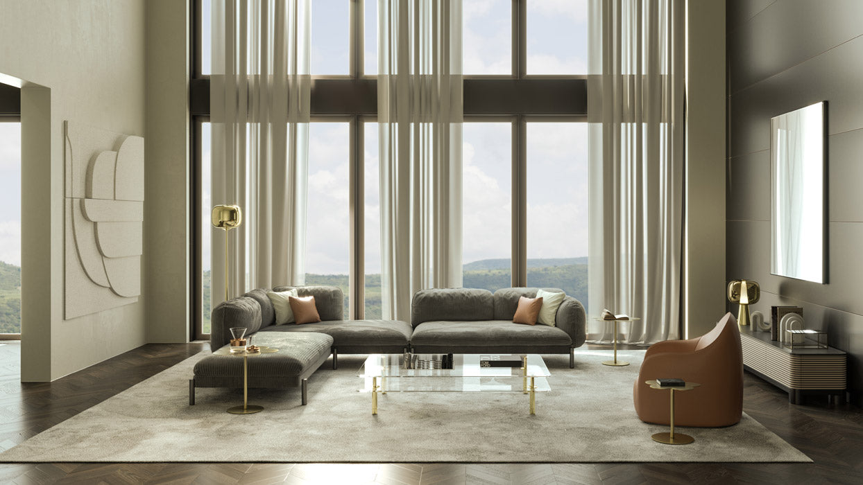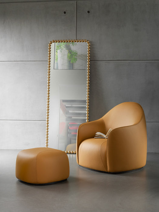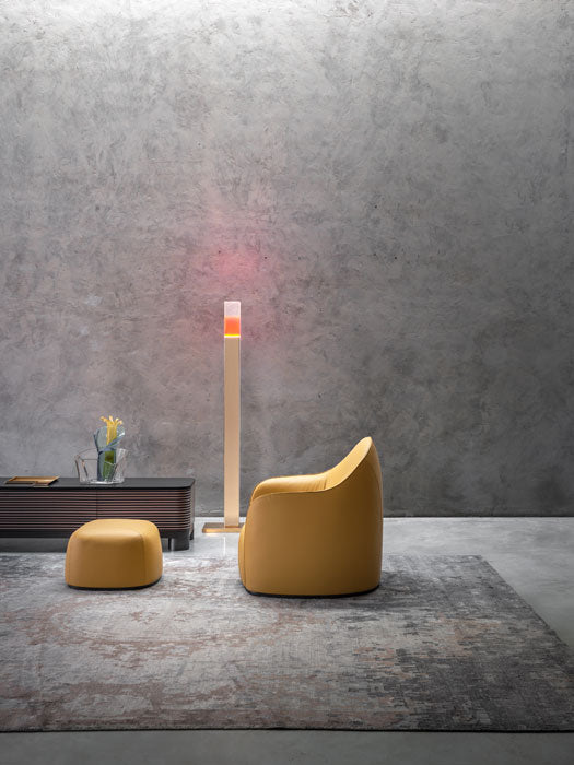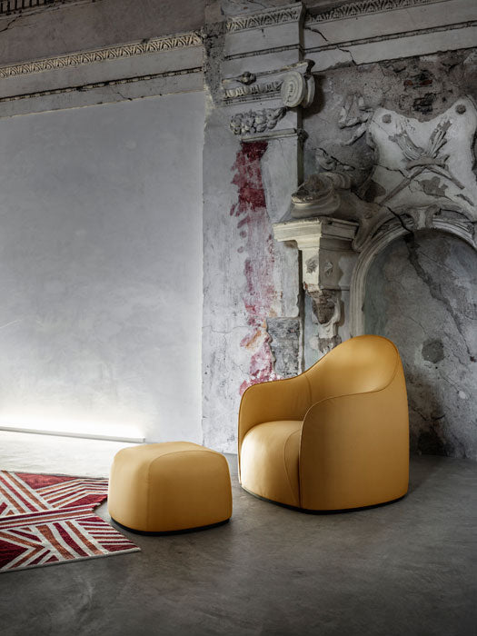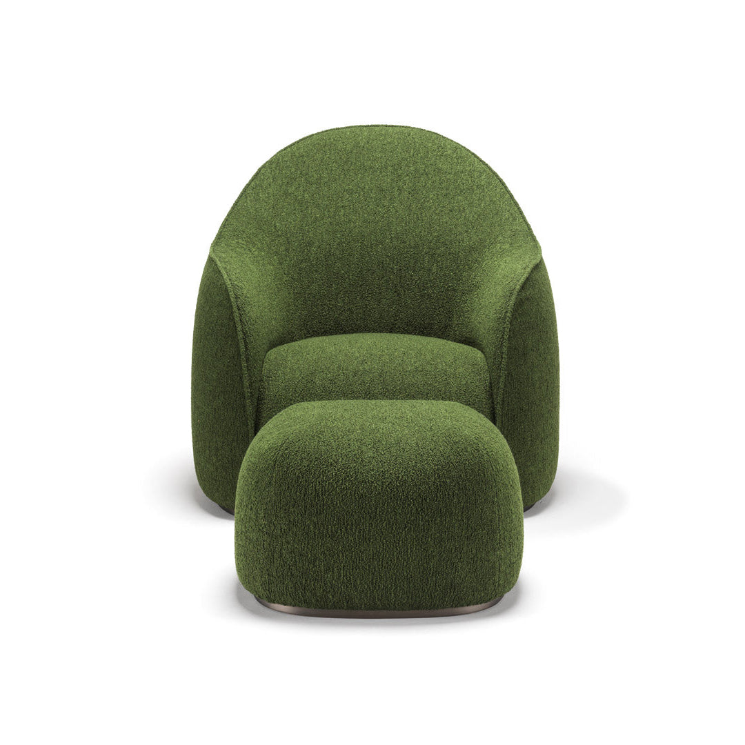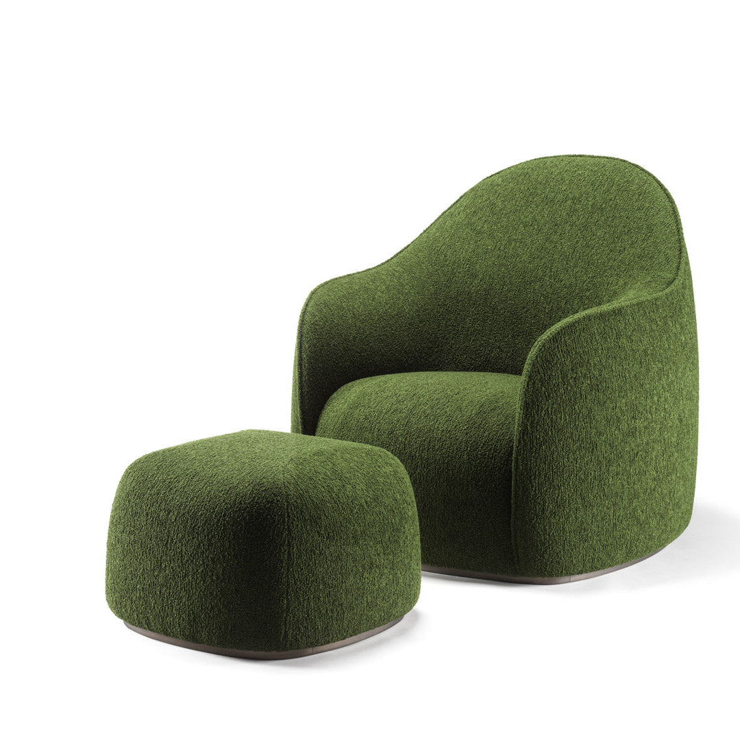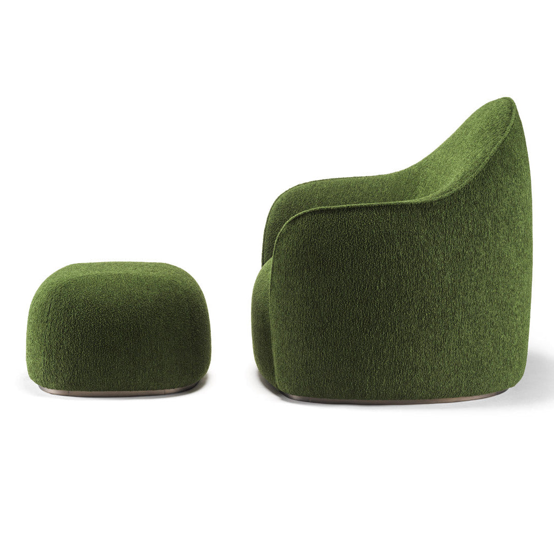Inside it is a classic bergère while the rear view projects a more sculptural and prominent presence. A cozy and sweet "Panettone" where you can sit resting your feet on a soft ottoman.