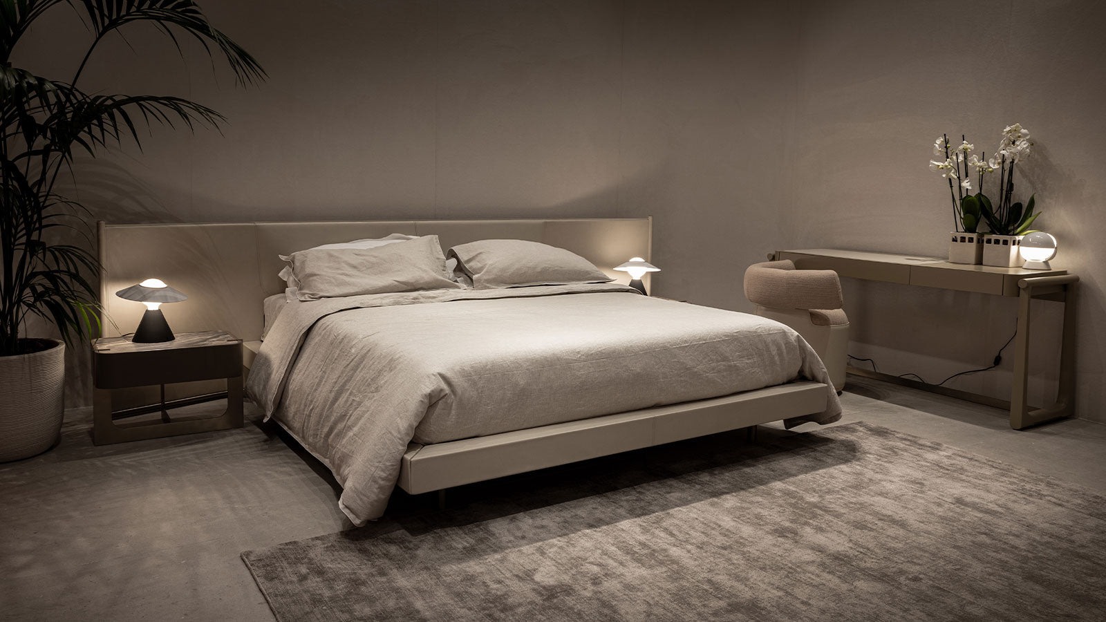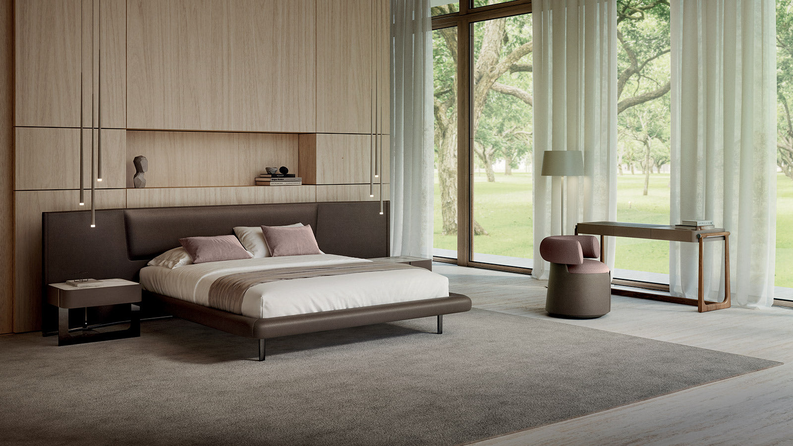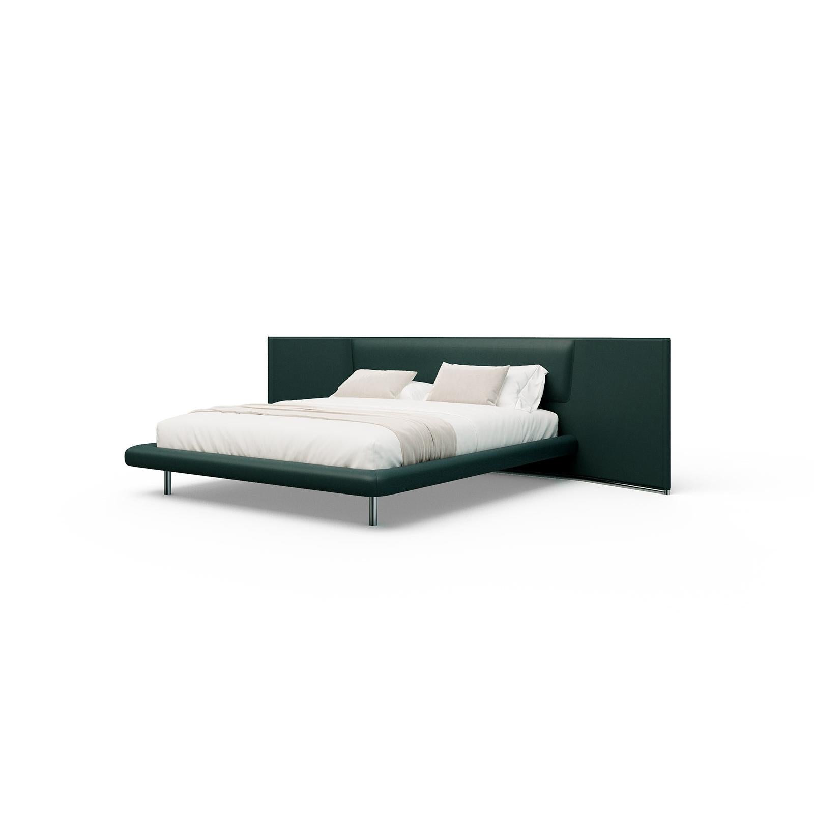Refined bed featuring a wide leather-covered headboard with a rounded central silhouette, enhancing both comfort and sophistication in its design.