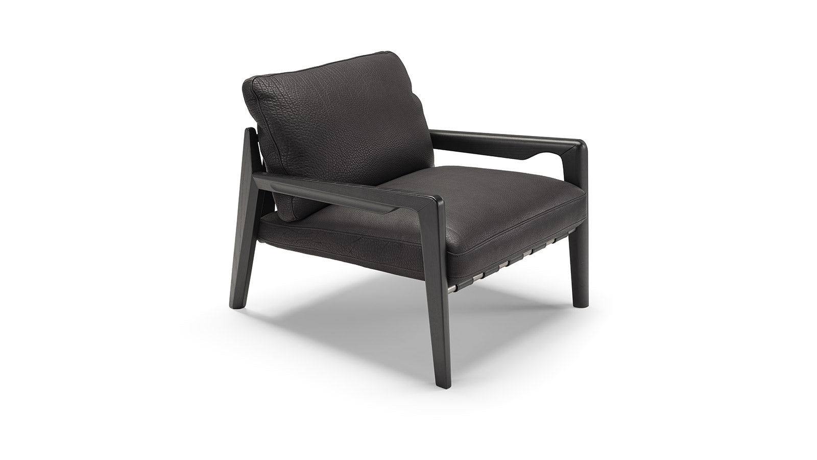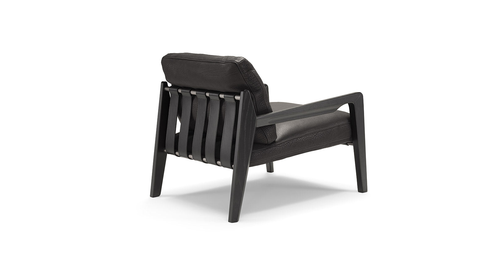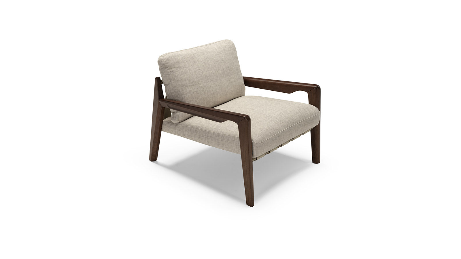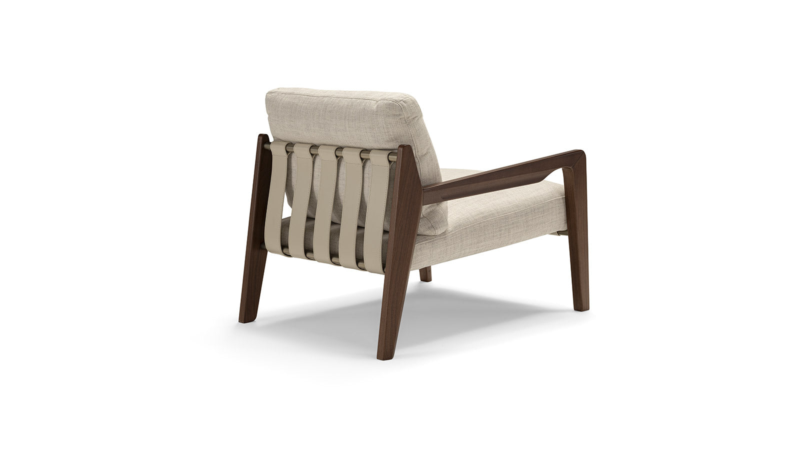 The concept of the Olimpia armchair is sophisticated and innovative, reminiscent of models from the 1930s and 1950s. It features pleasingly detailed design, from the snappy wooden legs to the straps.