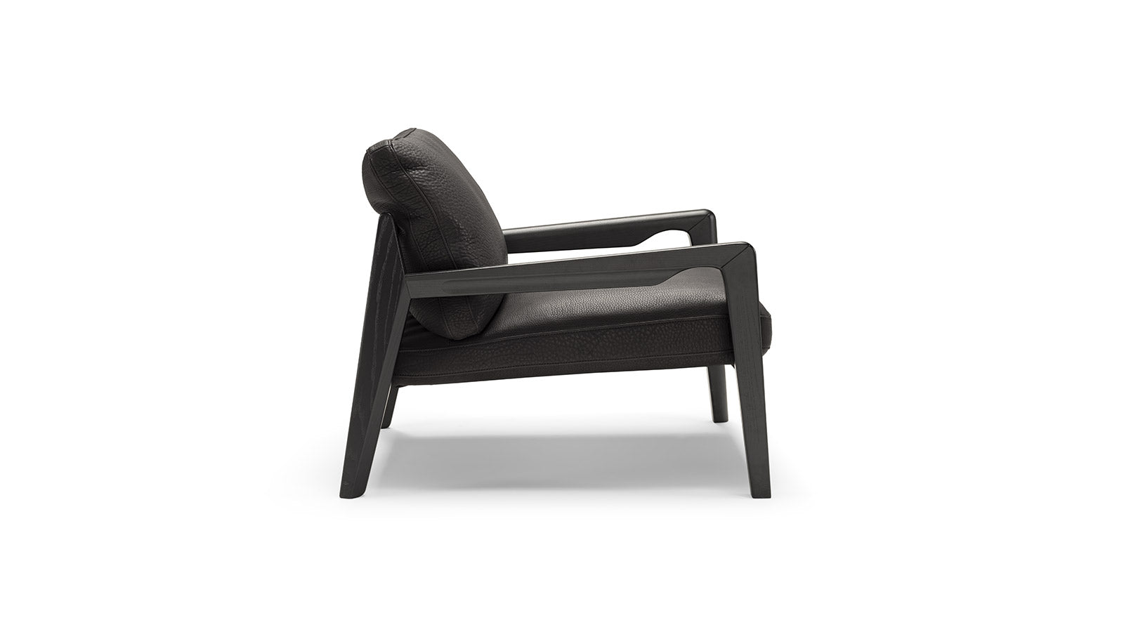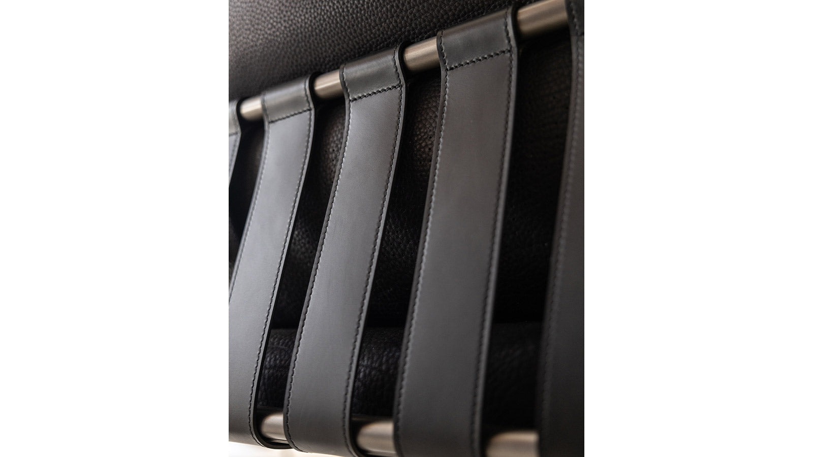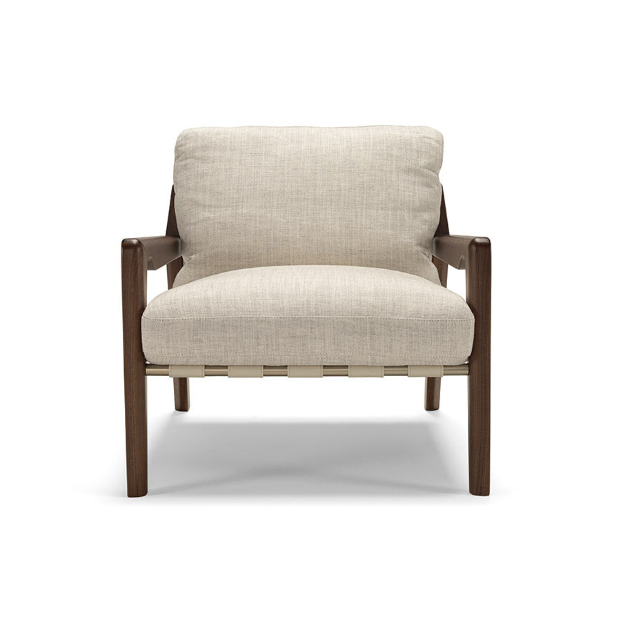 The concept of the Olimpia armchair is sophisticated and innovative, reminiscent of models from the 1930s and 1950s. It features pleasingly detailed design, from the snappy wooden legs to the straps.