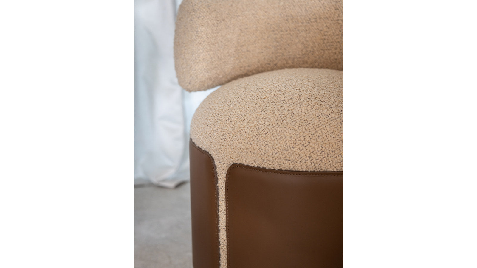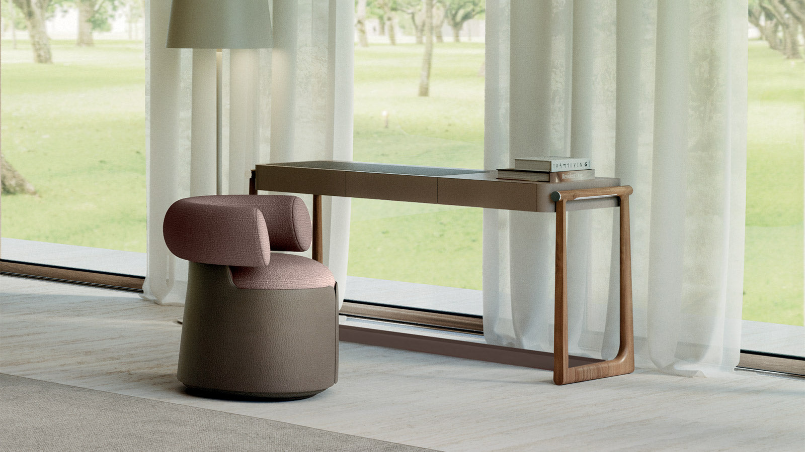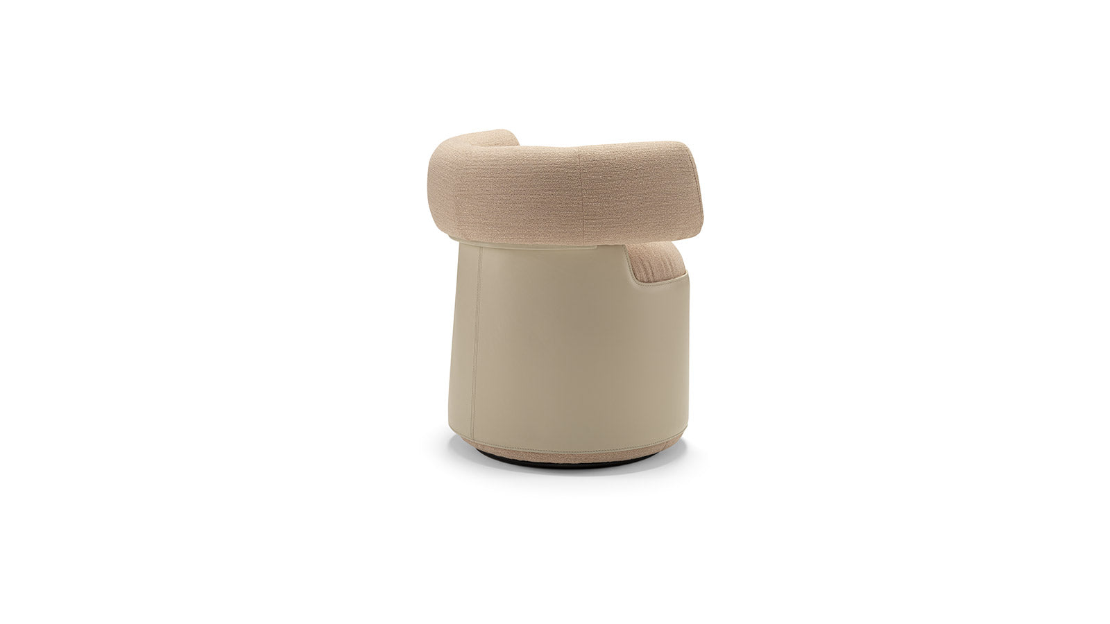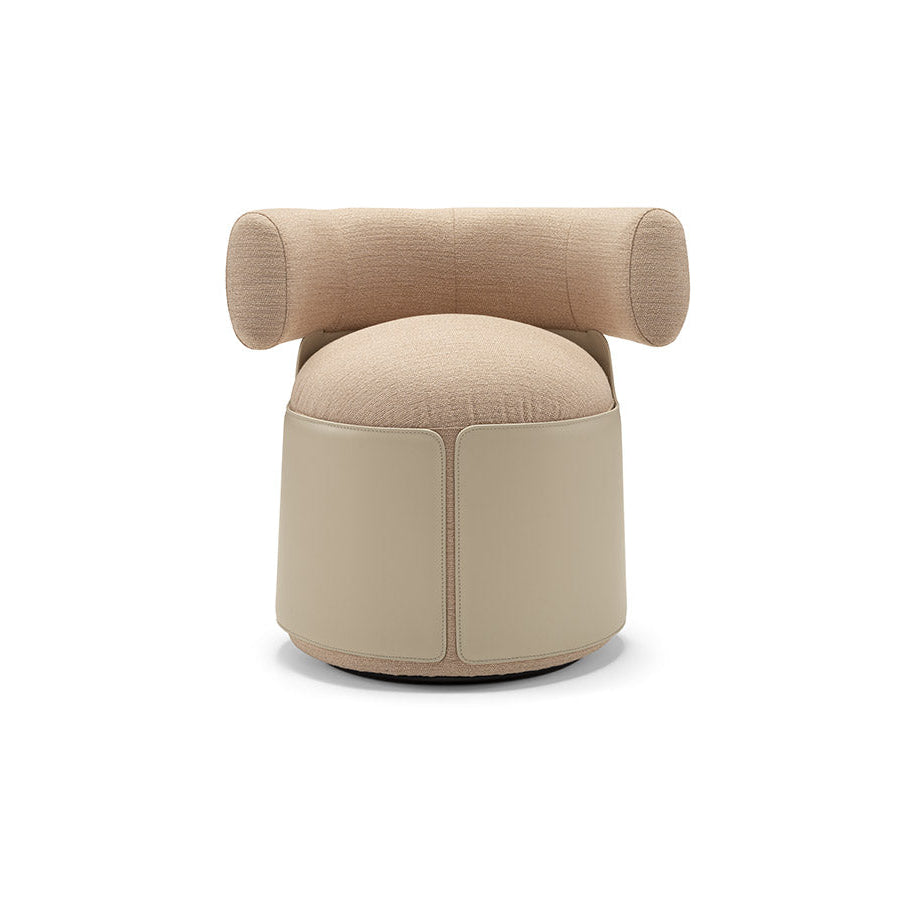 The Otium armchair is born from the harmonious integration of an upholstered part, distinguished by a roll back, with a refined leather upholstery. This not only provides an excellent tactile sensation but also enhances its distinctive curved forms.