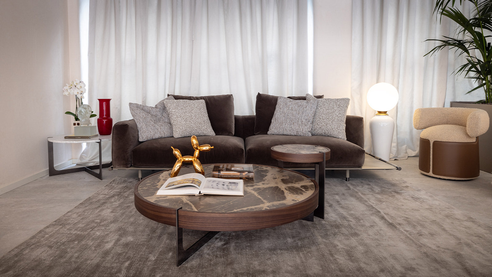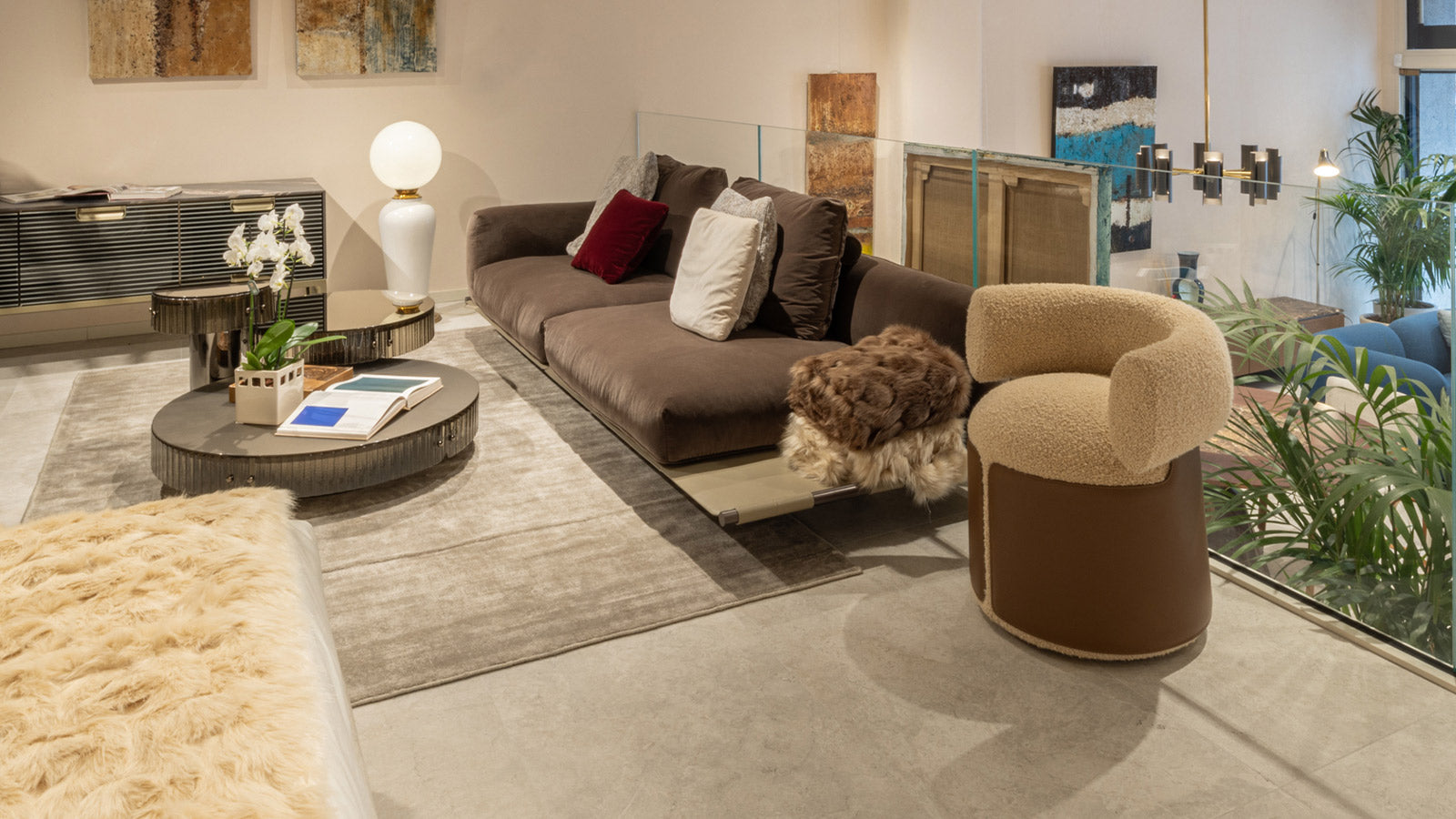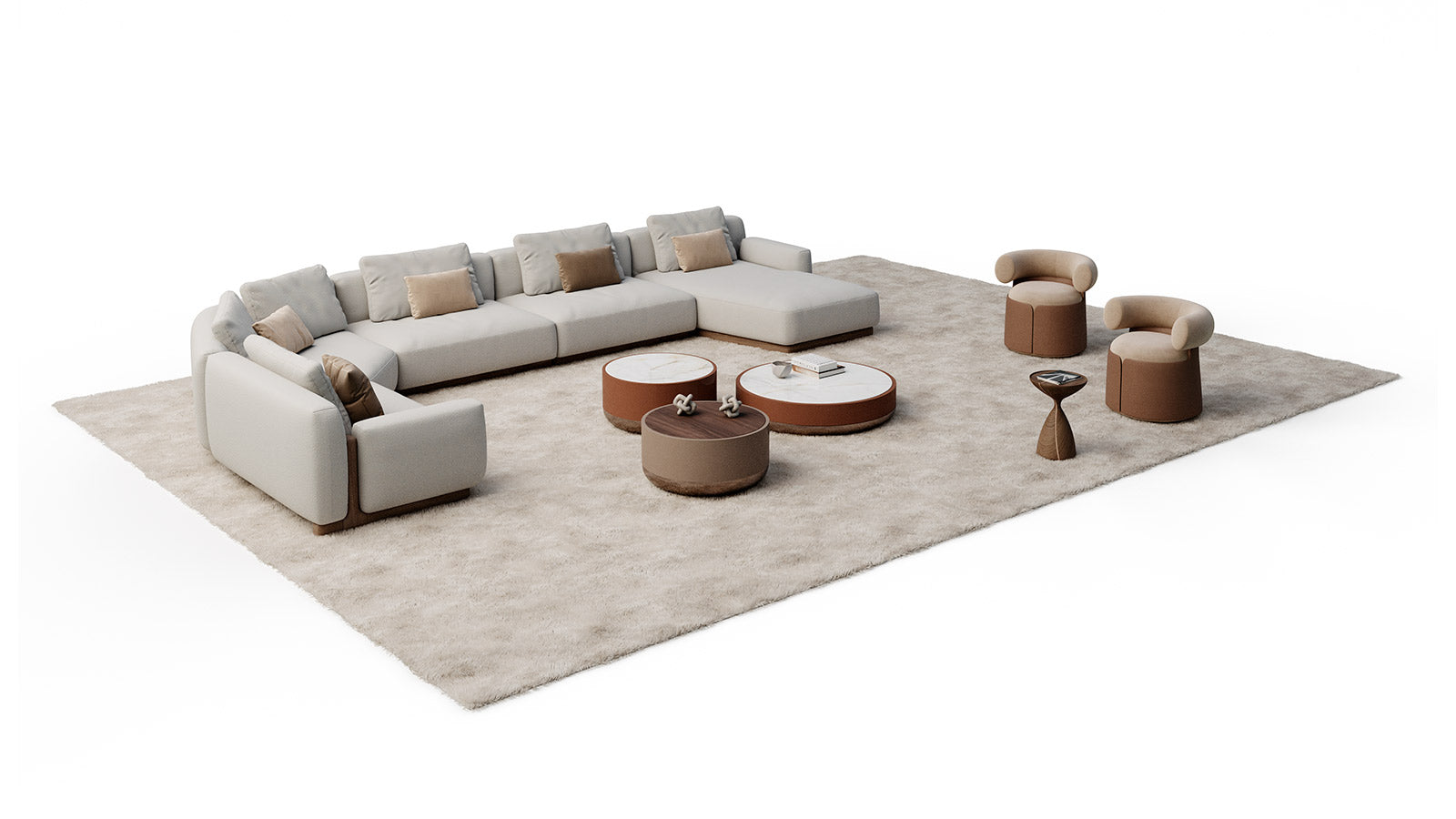 The Otium armchair is born from the harmonious integration of an upholstered part, distinguished by a roll back, with a refined leather upholstery. This not only provides an excellent tactile sensation but also enhances its distinctive curved forms.