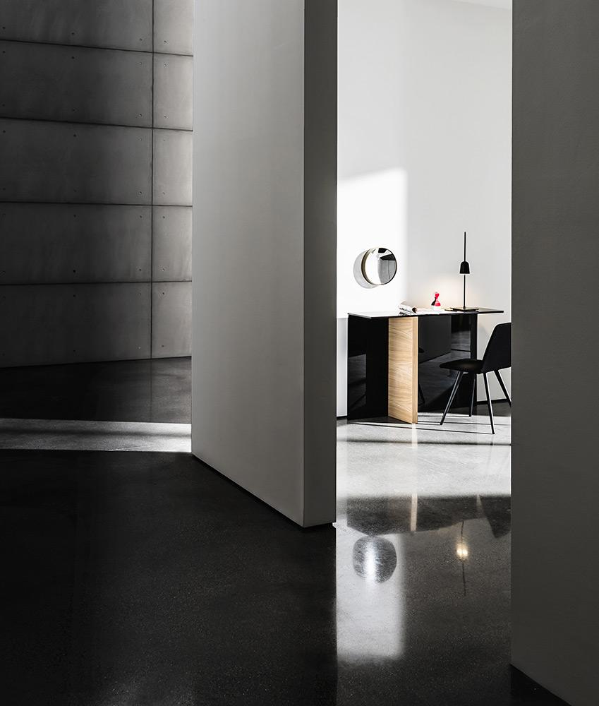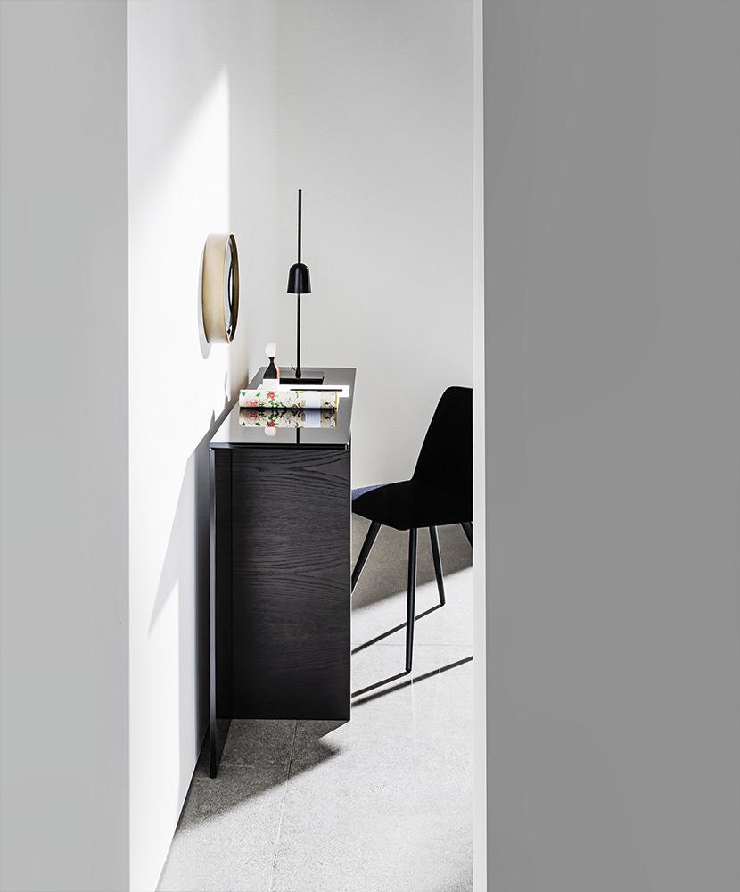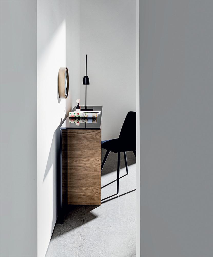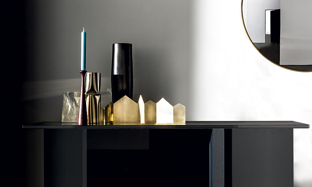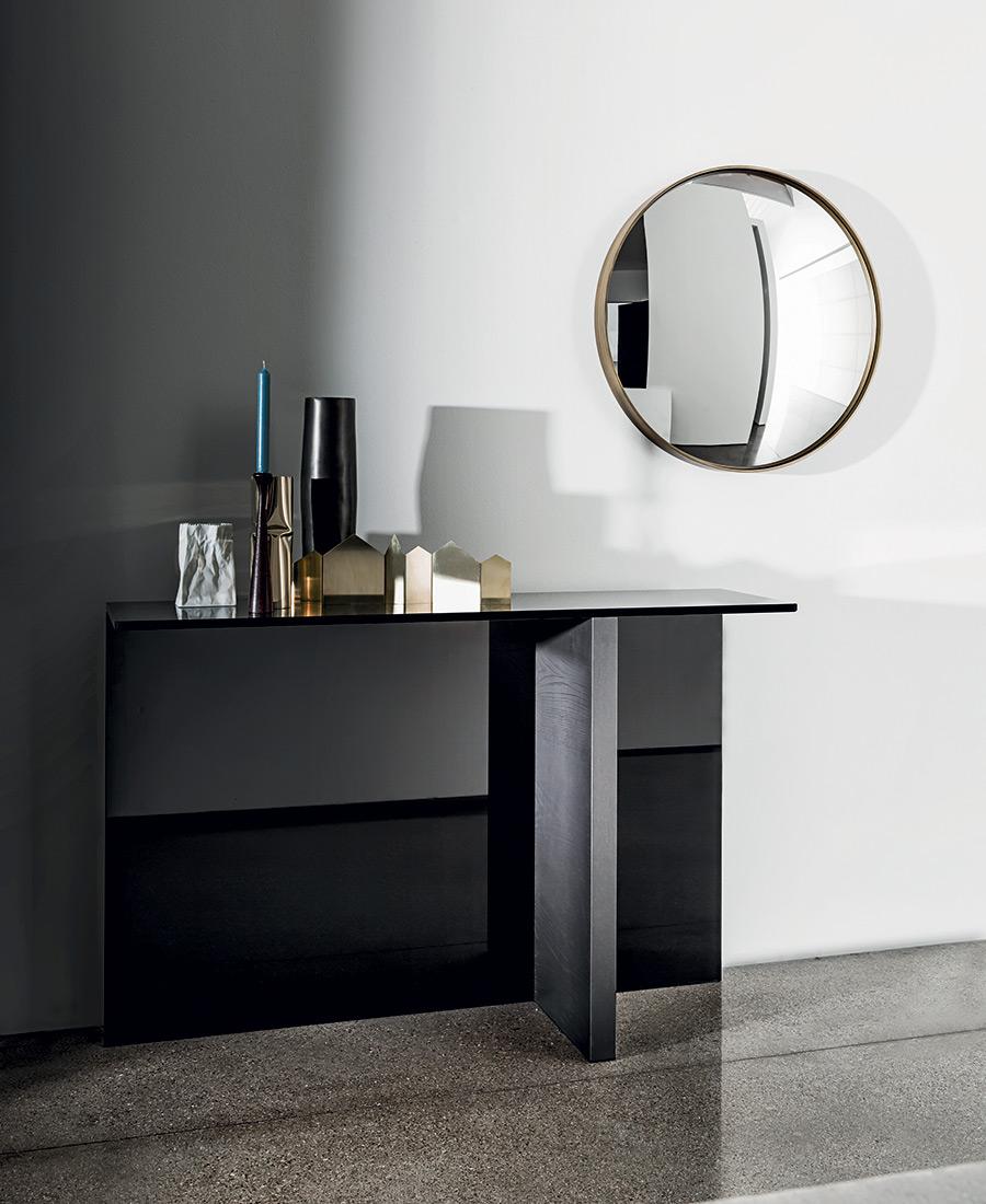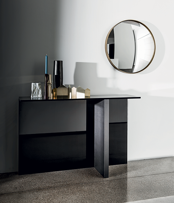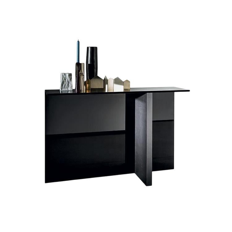 Console with smoked laminated glass top. Base composed of a wooden element, various finishes, and a black lacquered glass element.