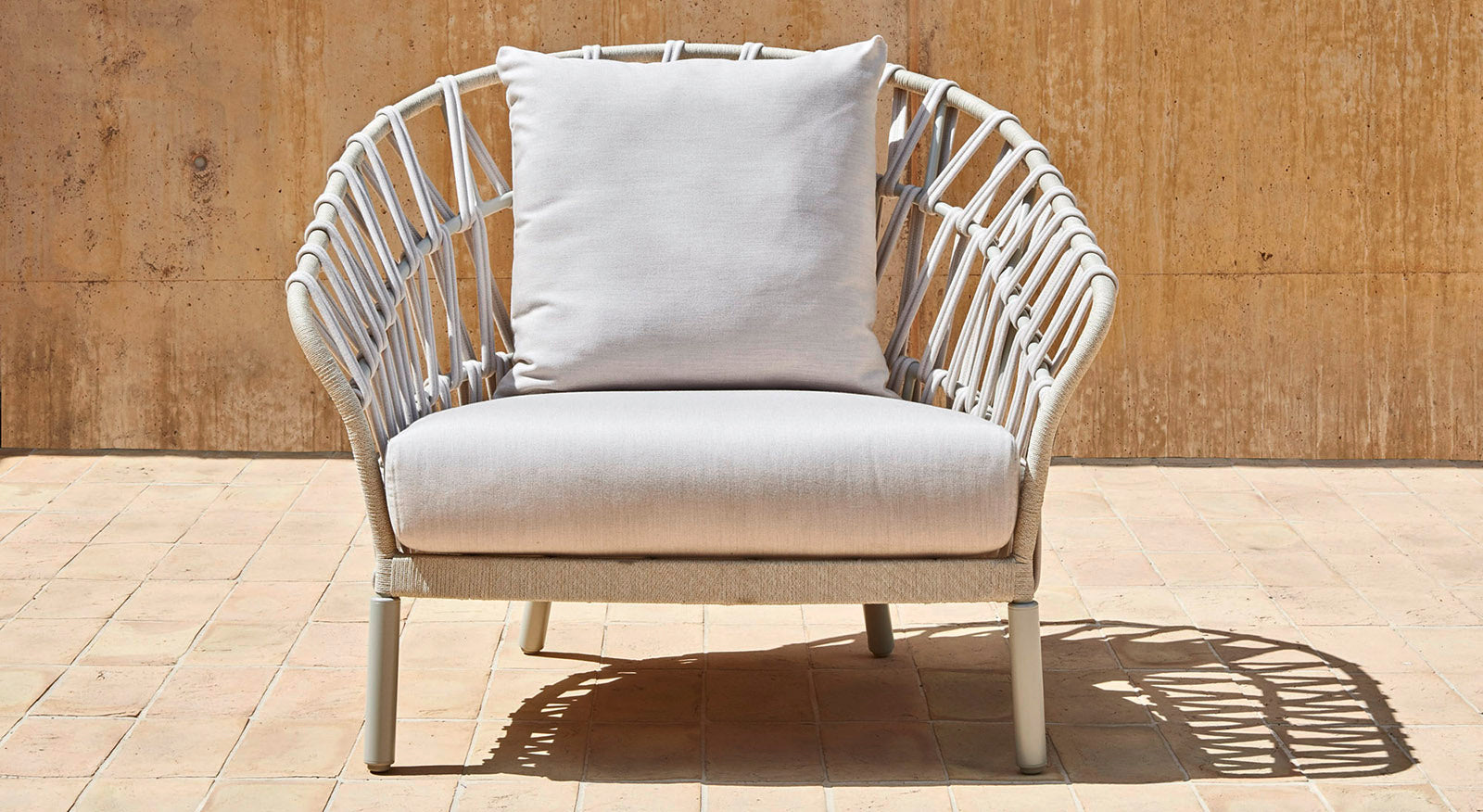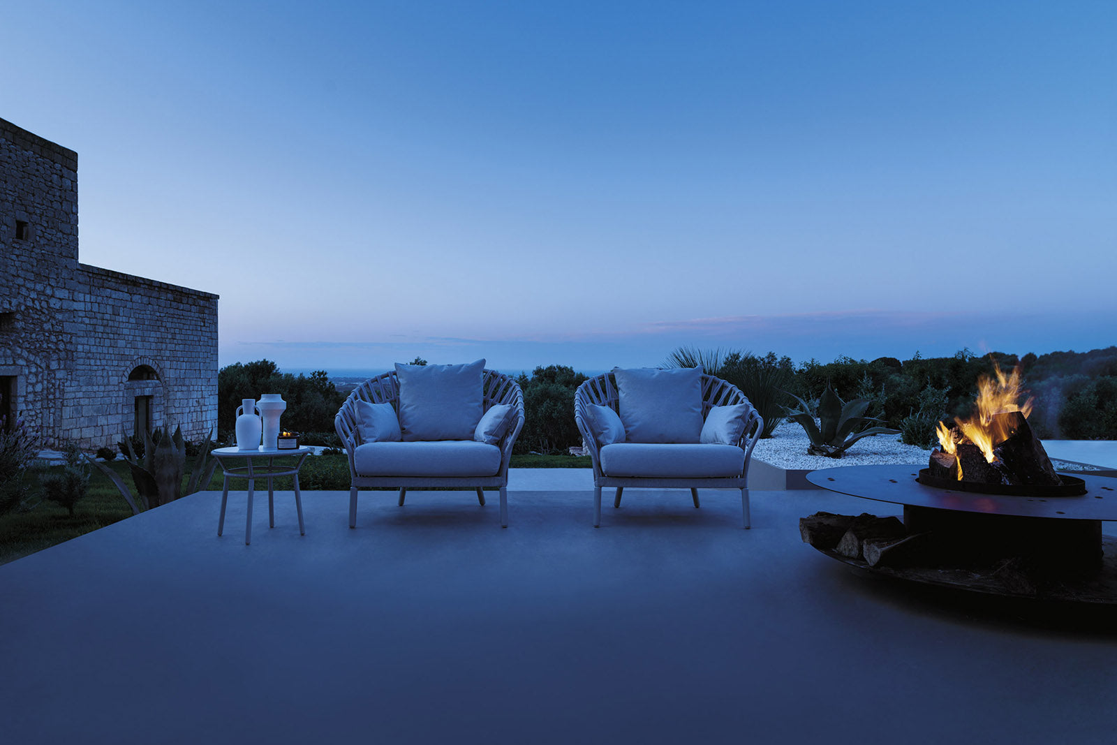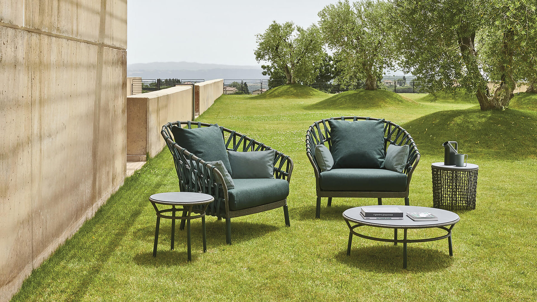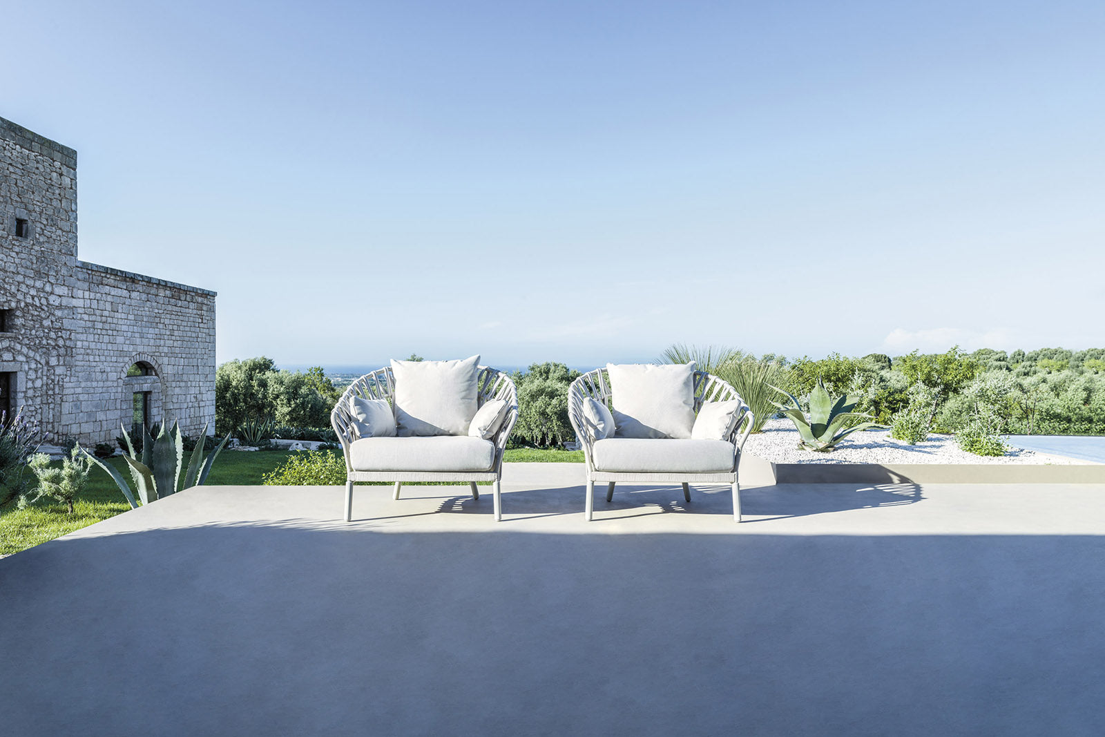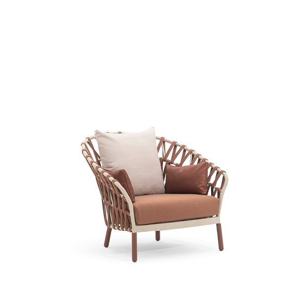 Open and at the same time enveloping shapes of the Emma Cross armchair, designed to elevate the idea of outdoor relaxation, projecting it into a dimension where aesthetics and ergonomics melt together in perfect harmony. A band in acrylic fabric is woven on the powder-coated aluminium frame. The upholstery of the seat is in fabric, padded with rubber Dryfeel® outdoor.