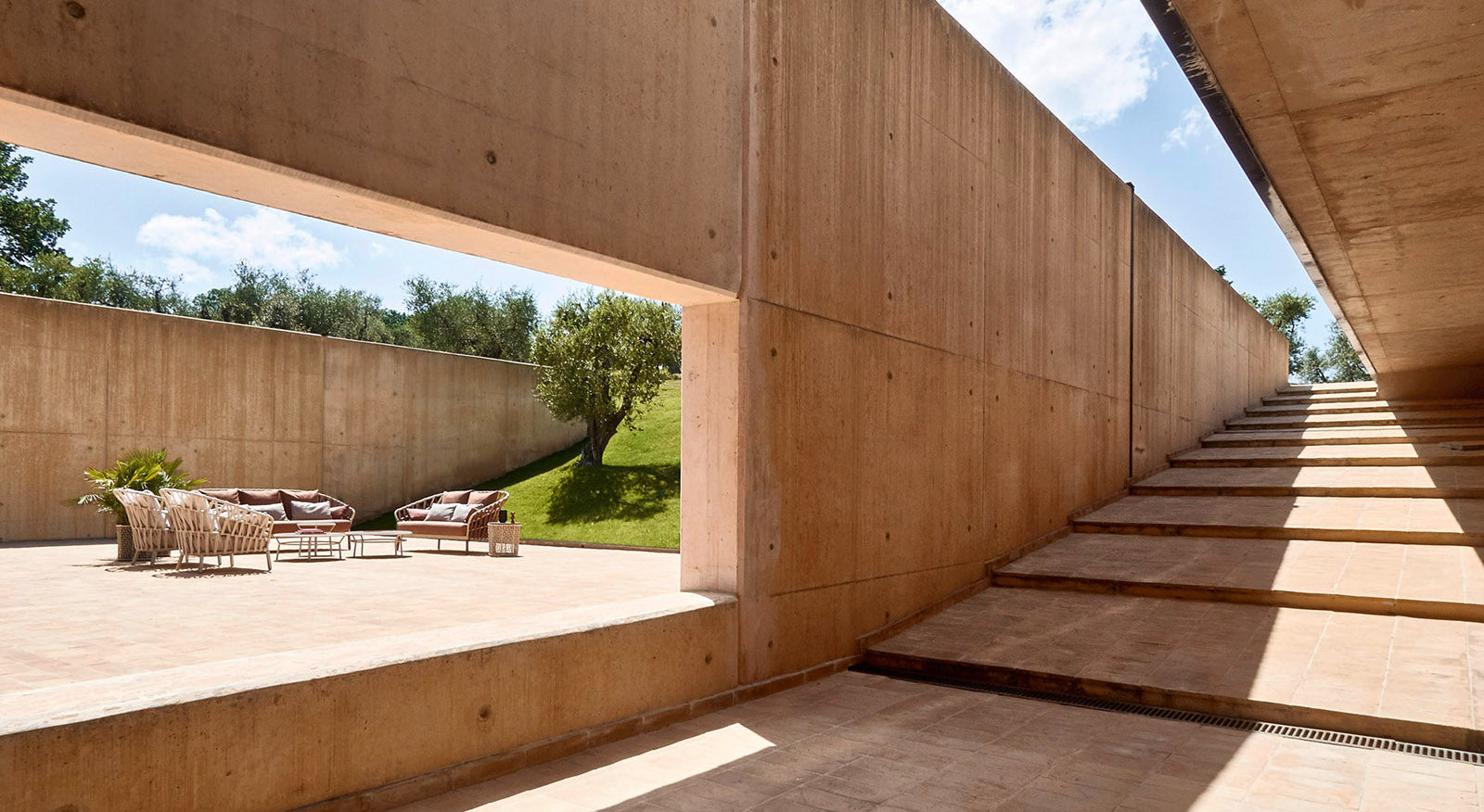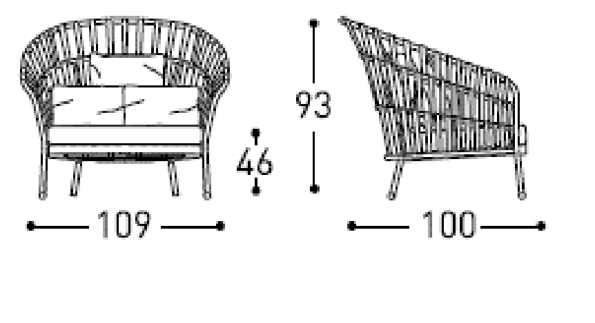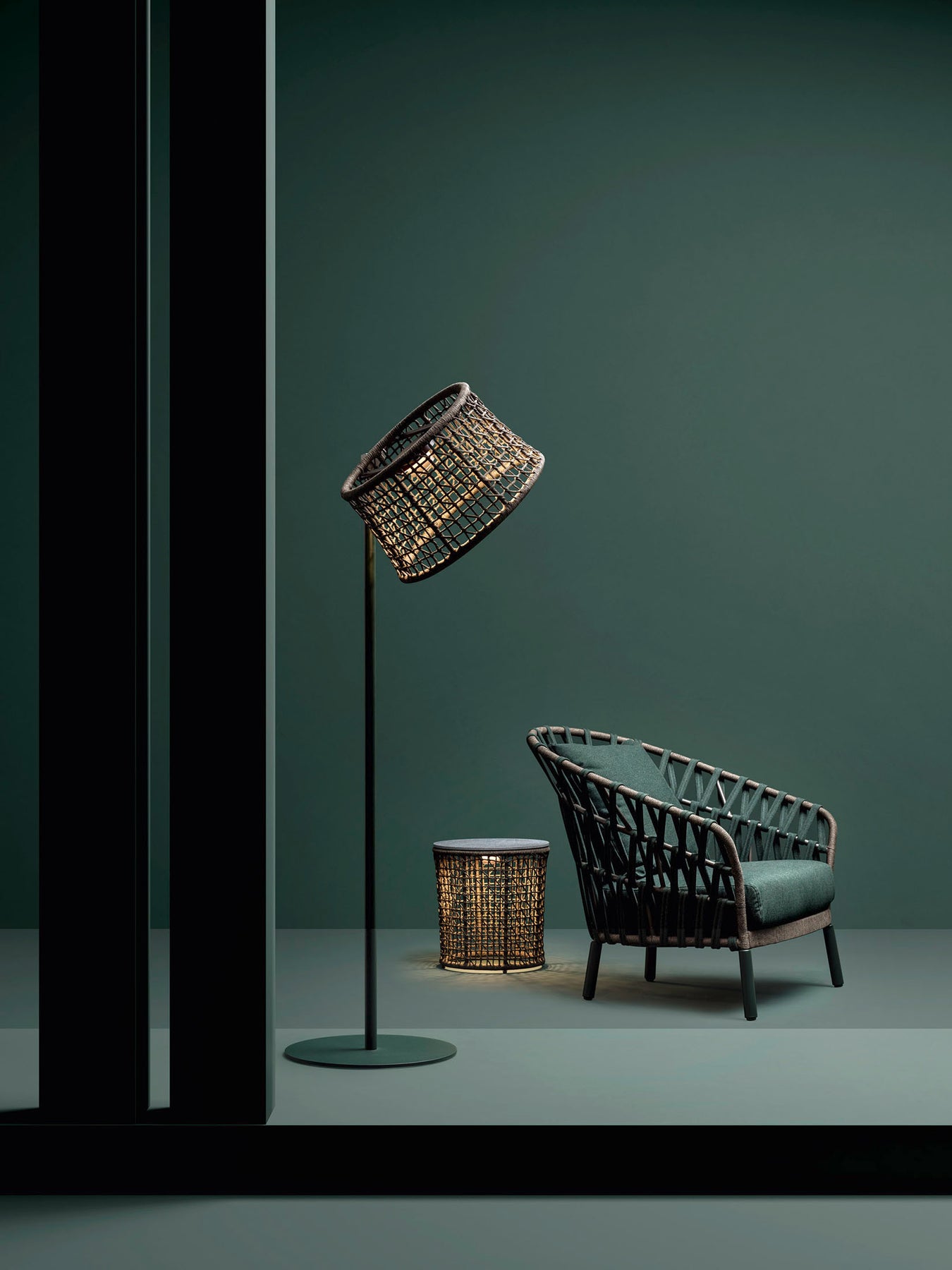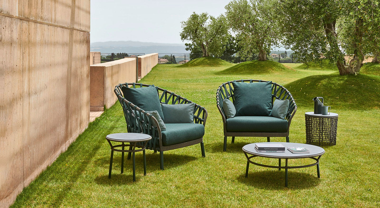Open and at the same time enveloping shapes of the Emma Cross armchair, designed to elevate the idea of outdoor relaxation, projecting it into a dimension where aesthetics and ergonomics melt together in perfect harmony. A band in acrylic fabric is woven on the powder-coated aluminium frame. The upholstery of the seat is in fabric, padded with rubber Dryfeel® outdoor.
