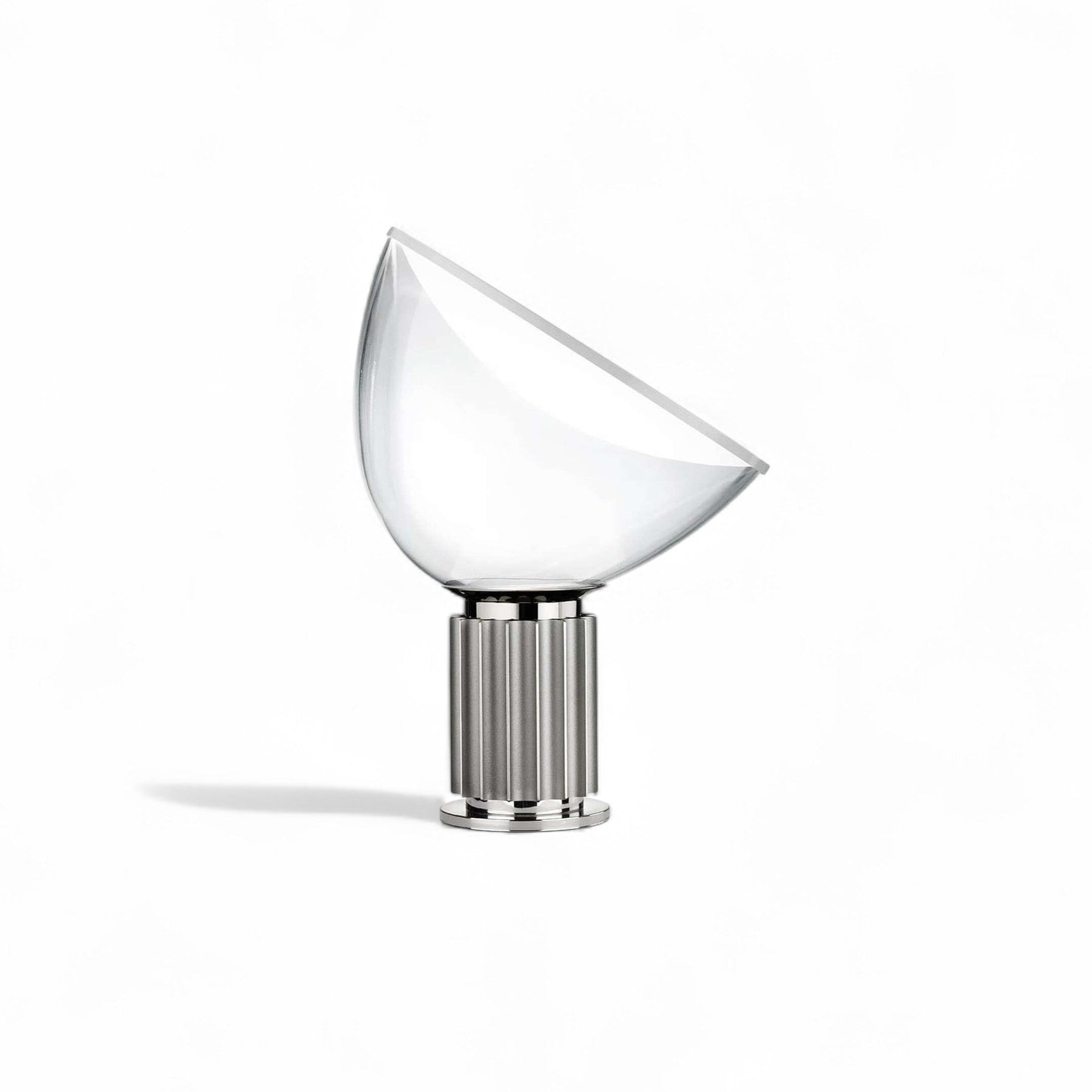 Designed by Achille & Pier Giacomo Castiglioni for Flos, the Taccia Small table lamp is a refined expression of functional elegance. Its distinctive design features a directional body in white painted aluminum that supports a blown clear glass diffuser, producing indirect and reflected light.