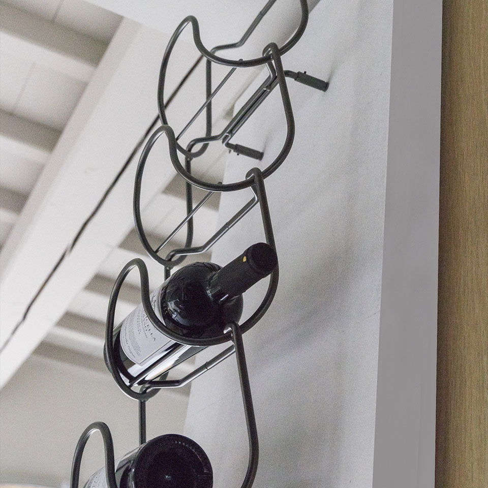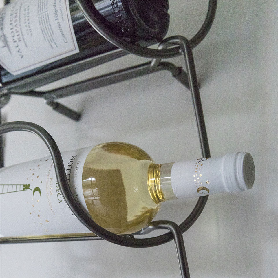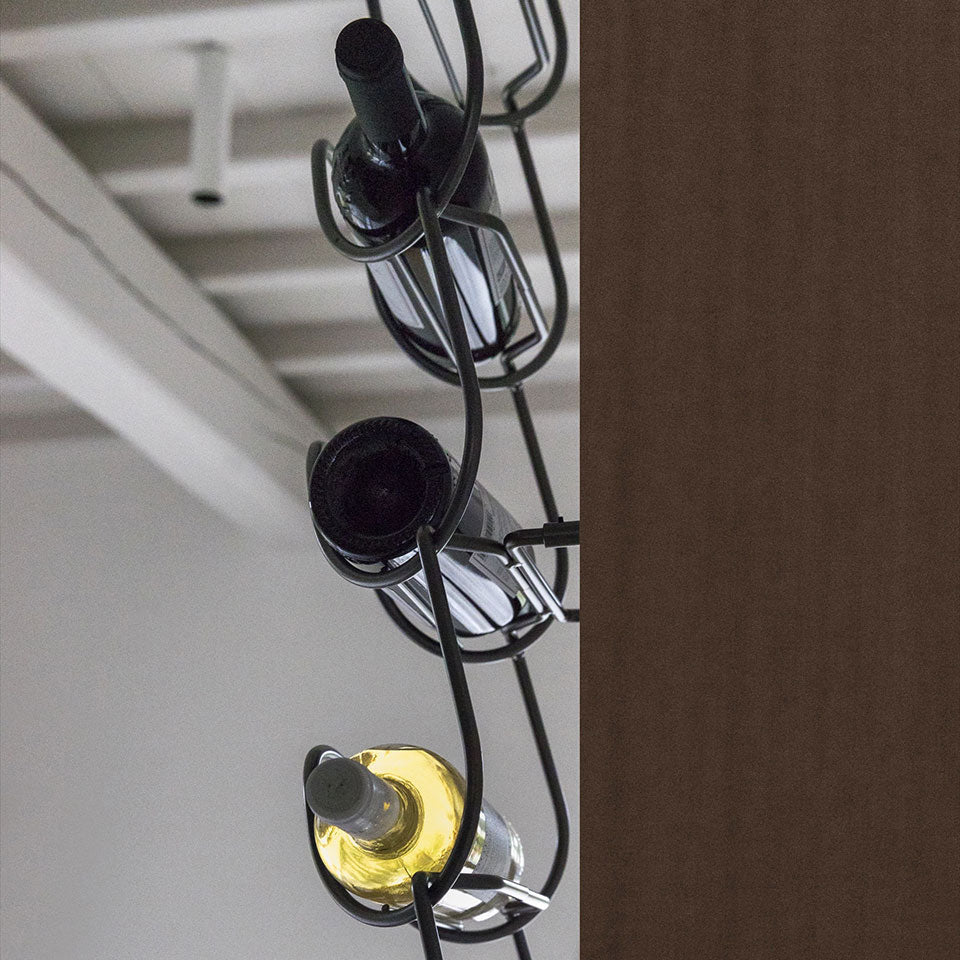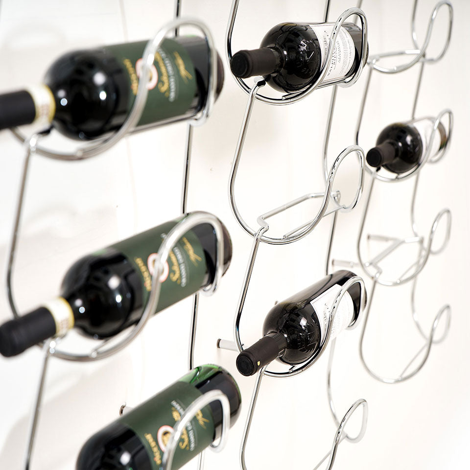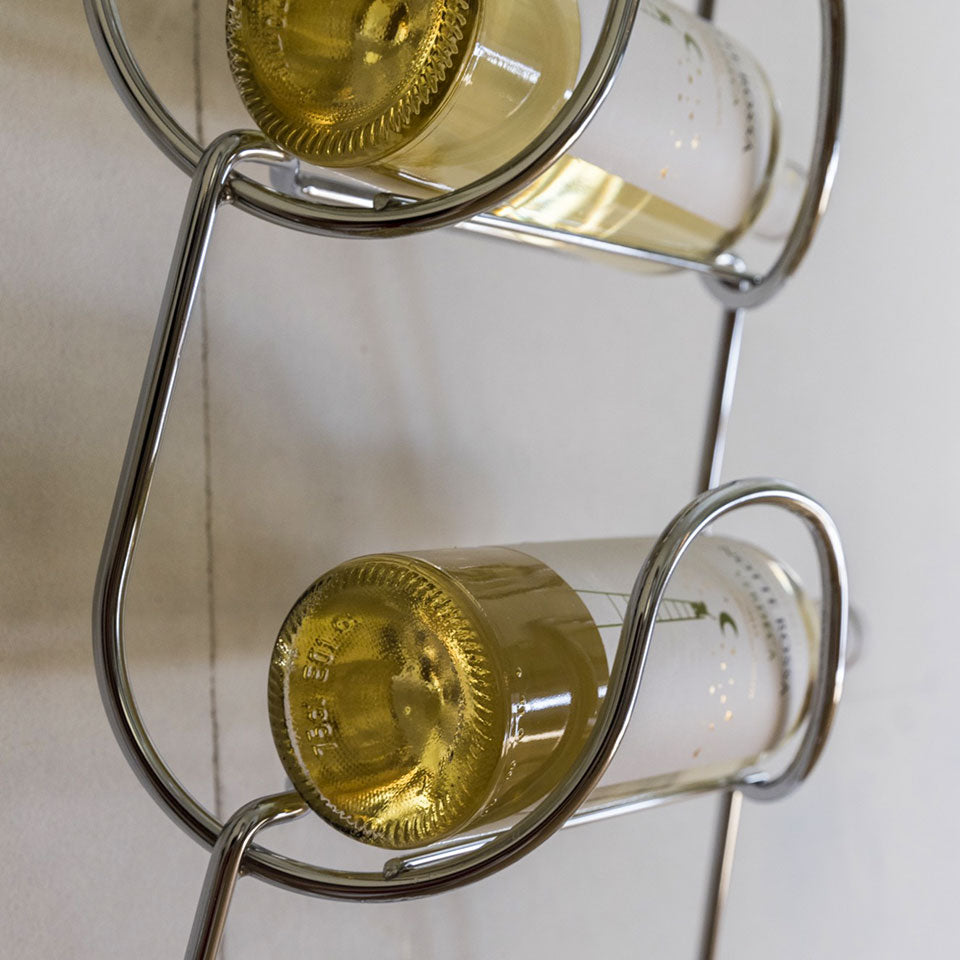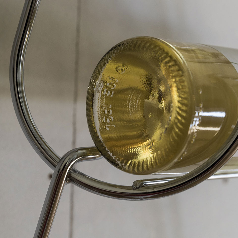 Metal bottle holder that comes from a single element and its repetition. An innovative and versatile solution, capable of accommodating bottles of different shapes and sizes, from the most common to the less conventional. Available in the finishes: burnished and chrome.