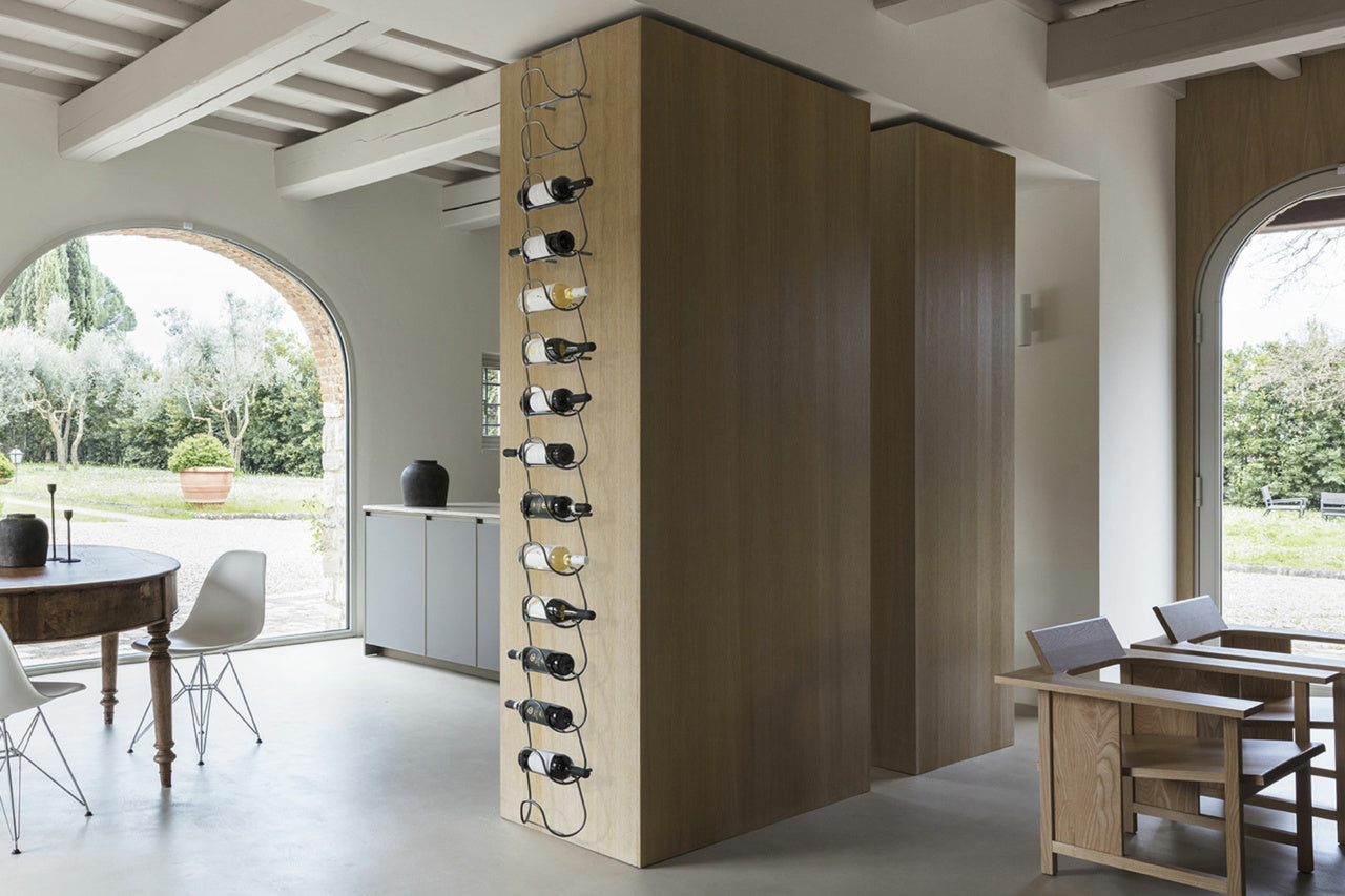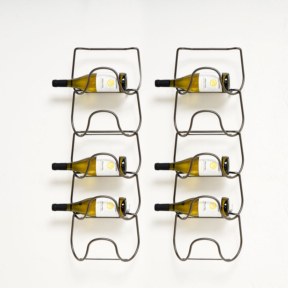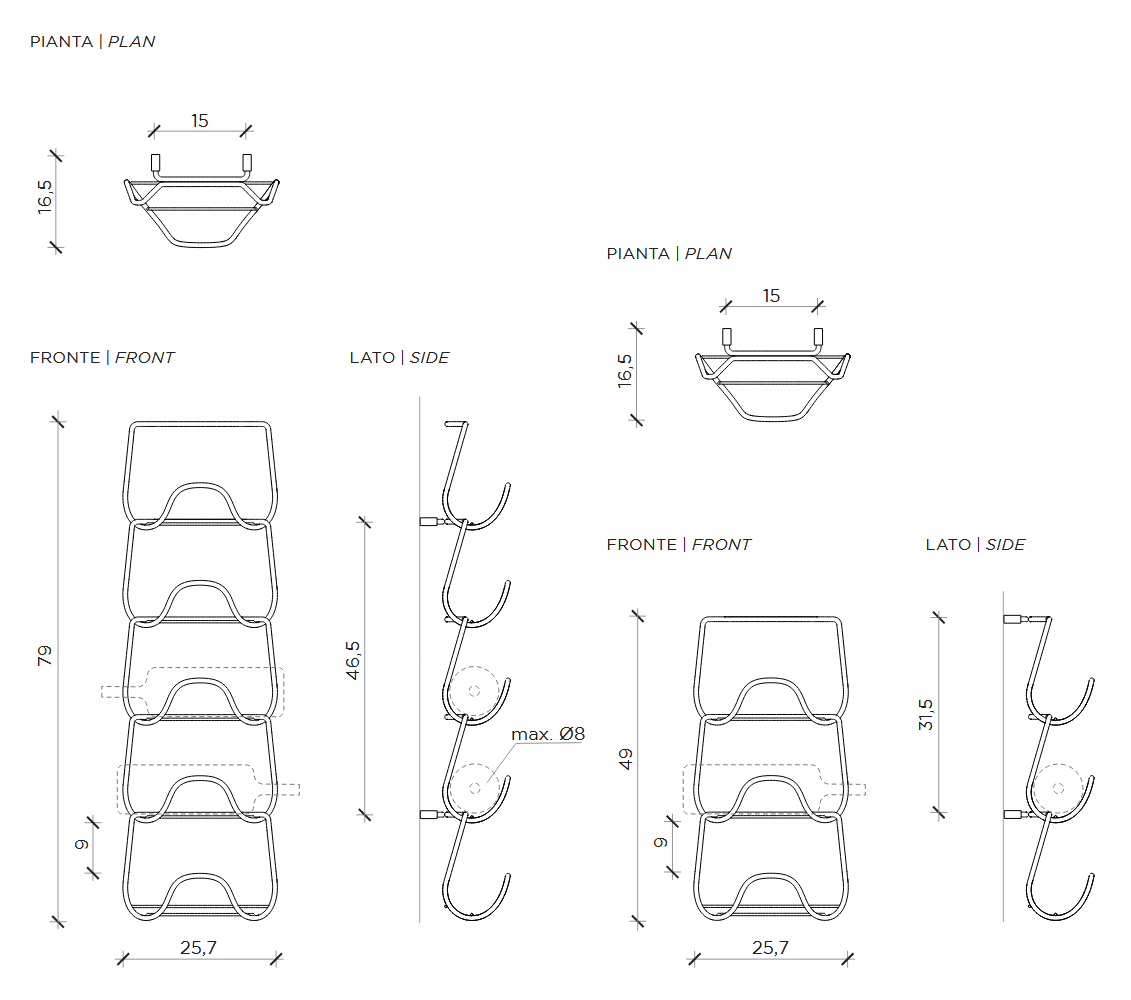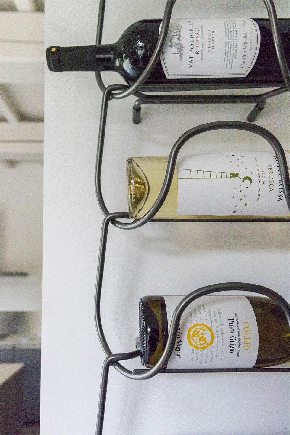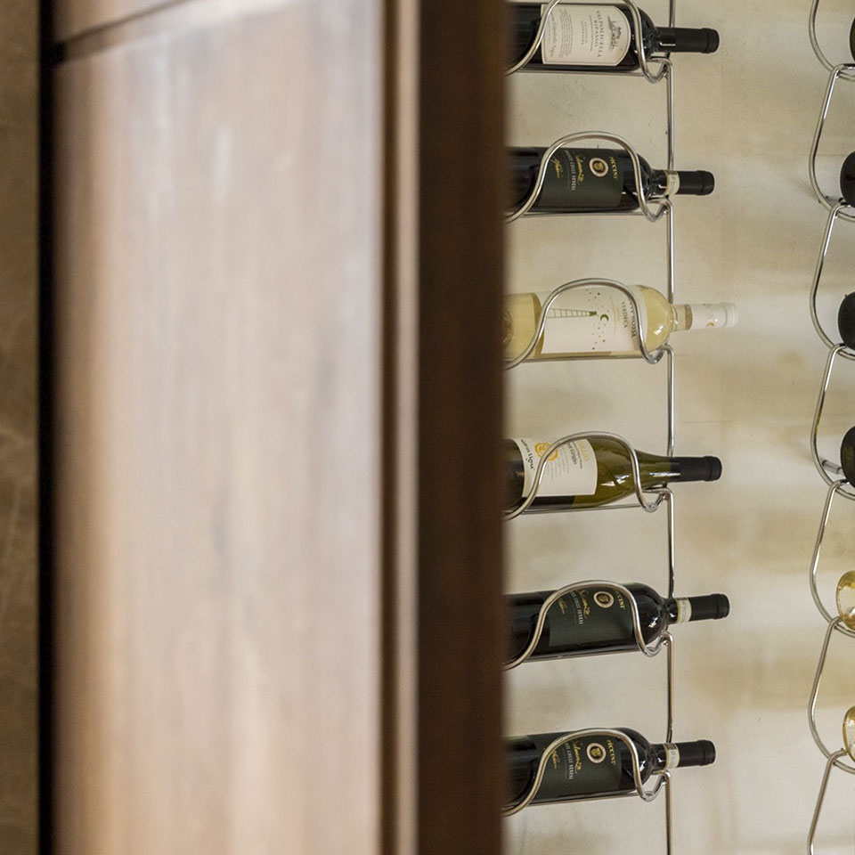 Metal bottle holder that comes from a single element and its repetition. An innovative and versatile solution, capable of accommodating bottles of different shapes and sizes, from the most common to the less conventional. Available in the finishes: burnished and chrome.