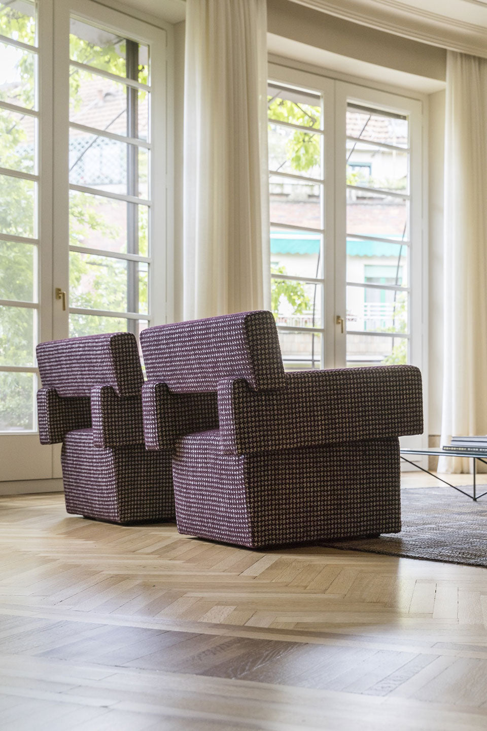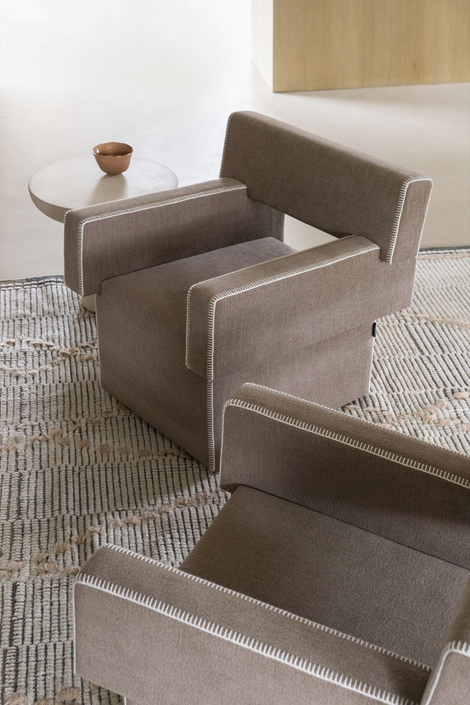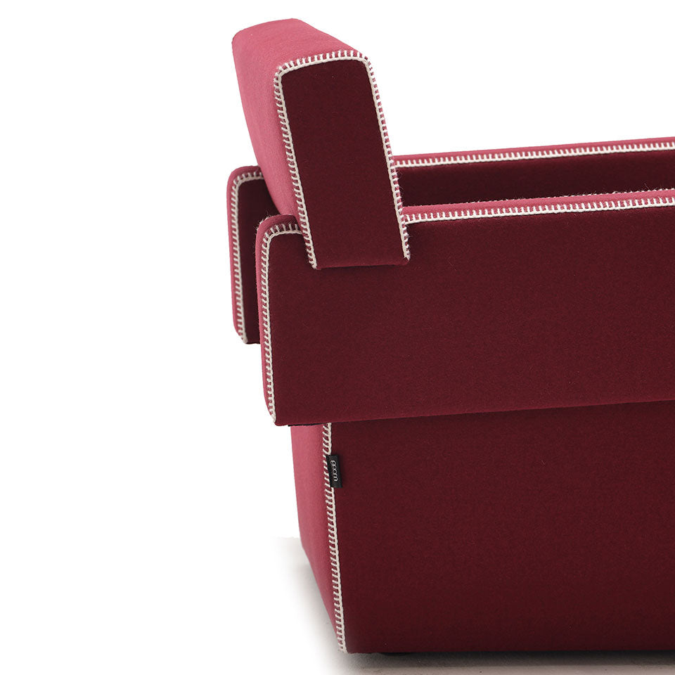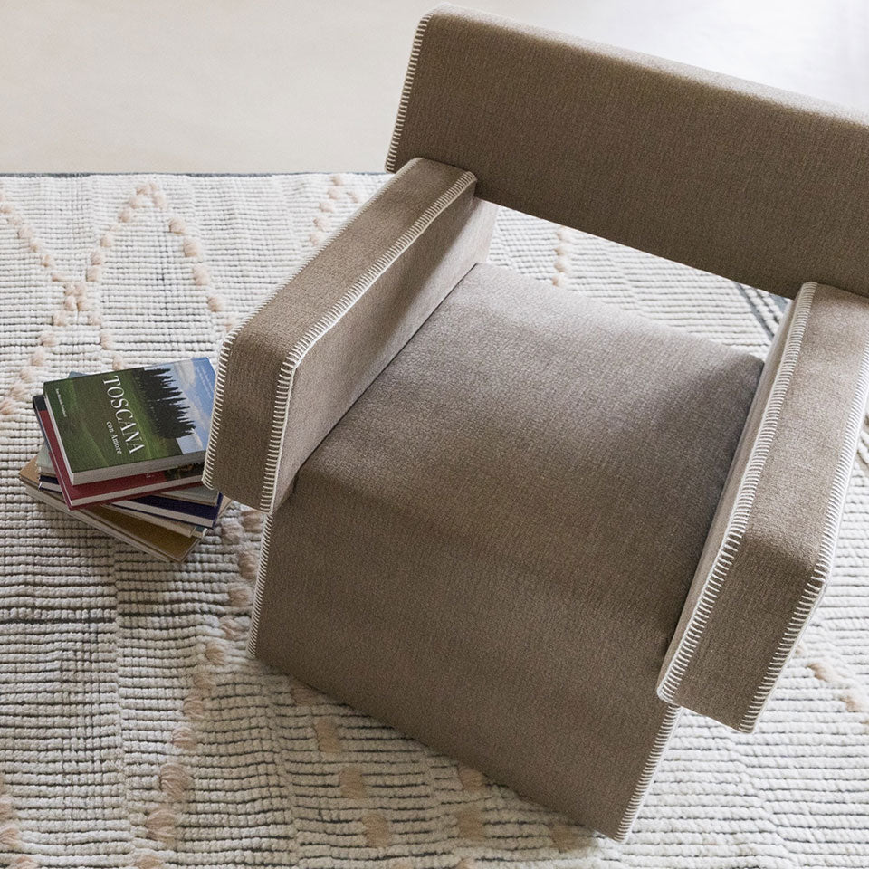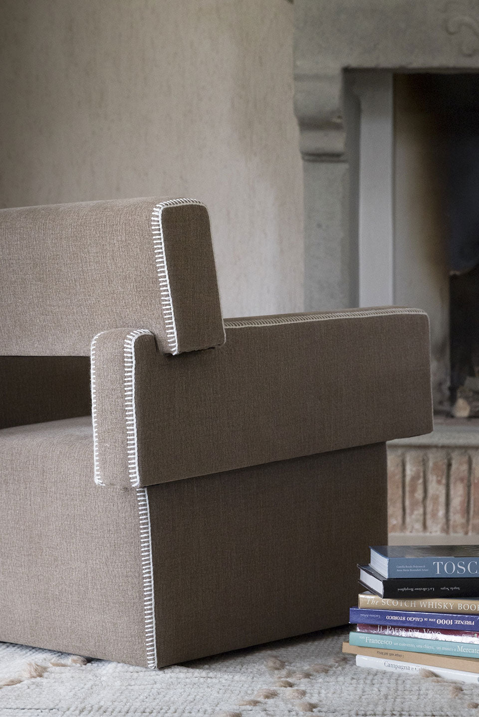 Padded armchair with non-removable cover, versatile and timeless, composed of simple and primary volumes with rigorous proportions, connected by a play of joints and overlaps in balance between form and function. On request with punto cavallo stitching.