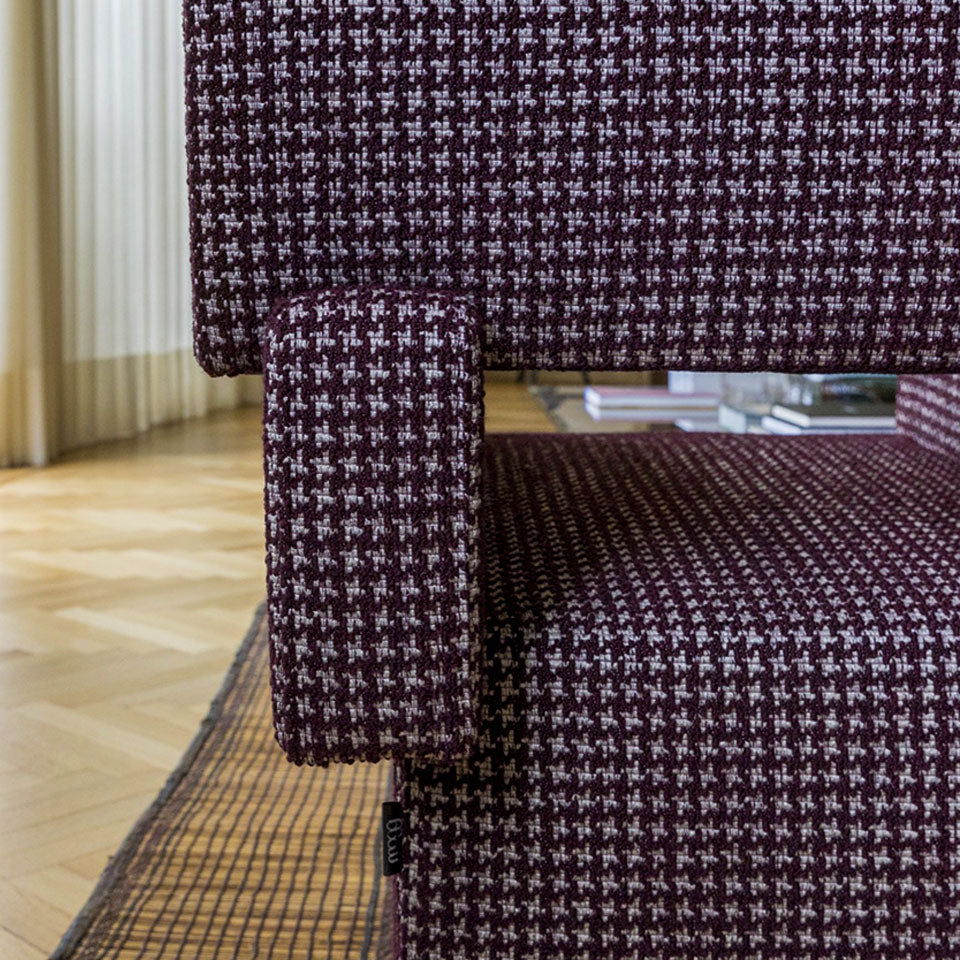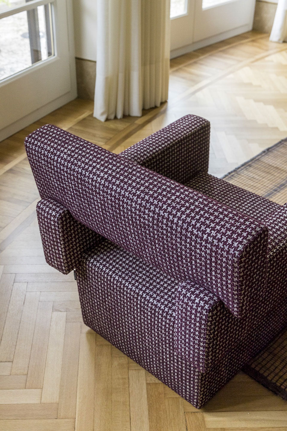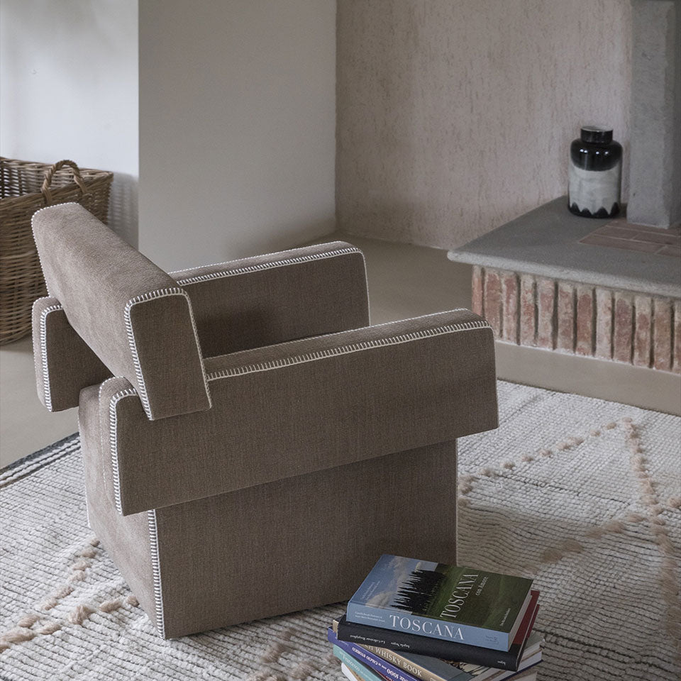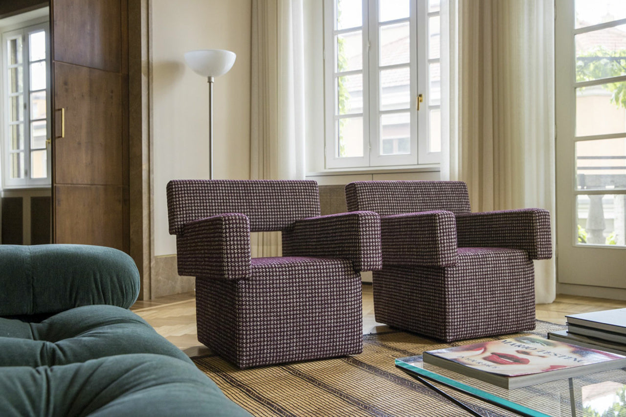 Padded armchair with non-removable cover, versatile and timeless, composed of simple and primary volumes with rigorous proportions, connected by a play of joints and overlaps in balance between form and function. On request with punto cavallo stitching.