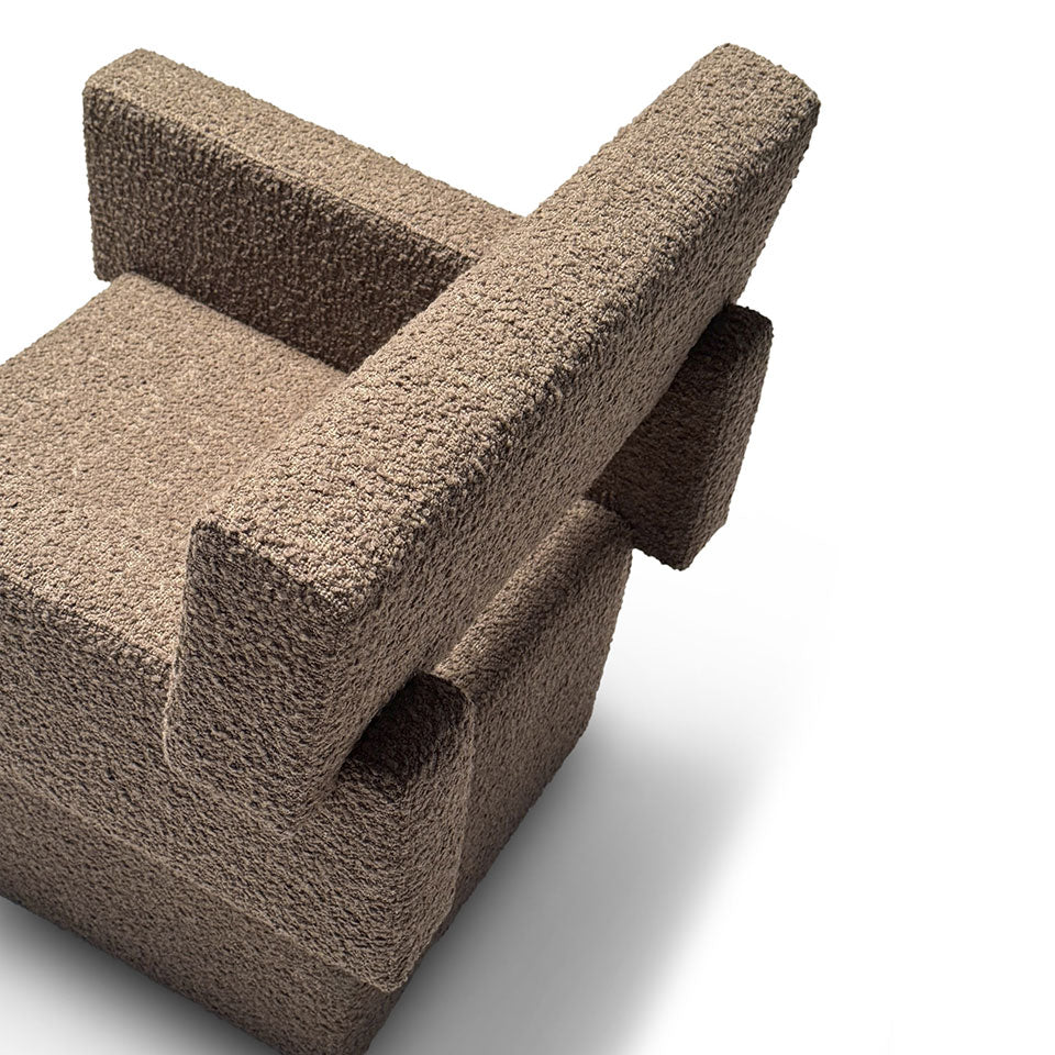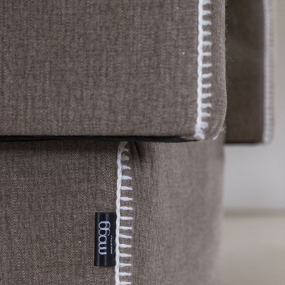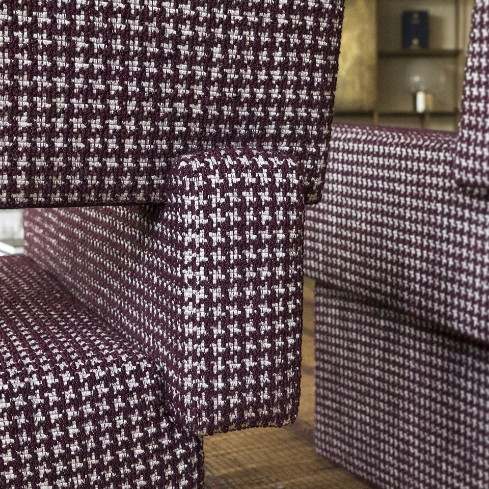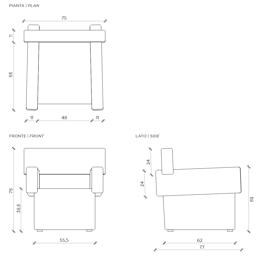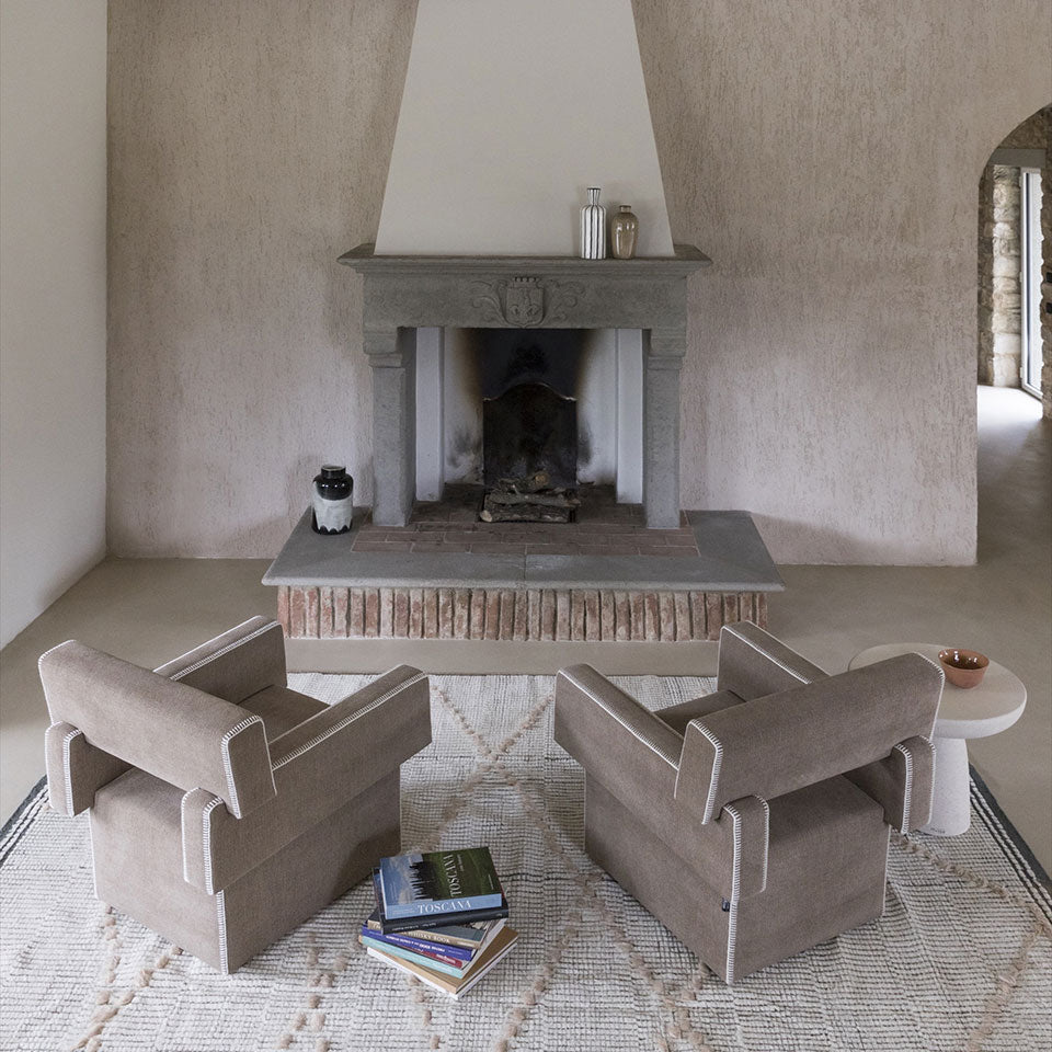 Padded armchair with non-removable cover, versatile and timeless, composed of simple and primary volumes with rigorous proportions, connected by a play of joints and overlaps in balance between form and function. On request with punto cavallo stitching.