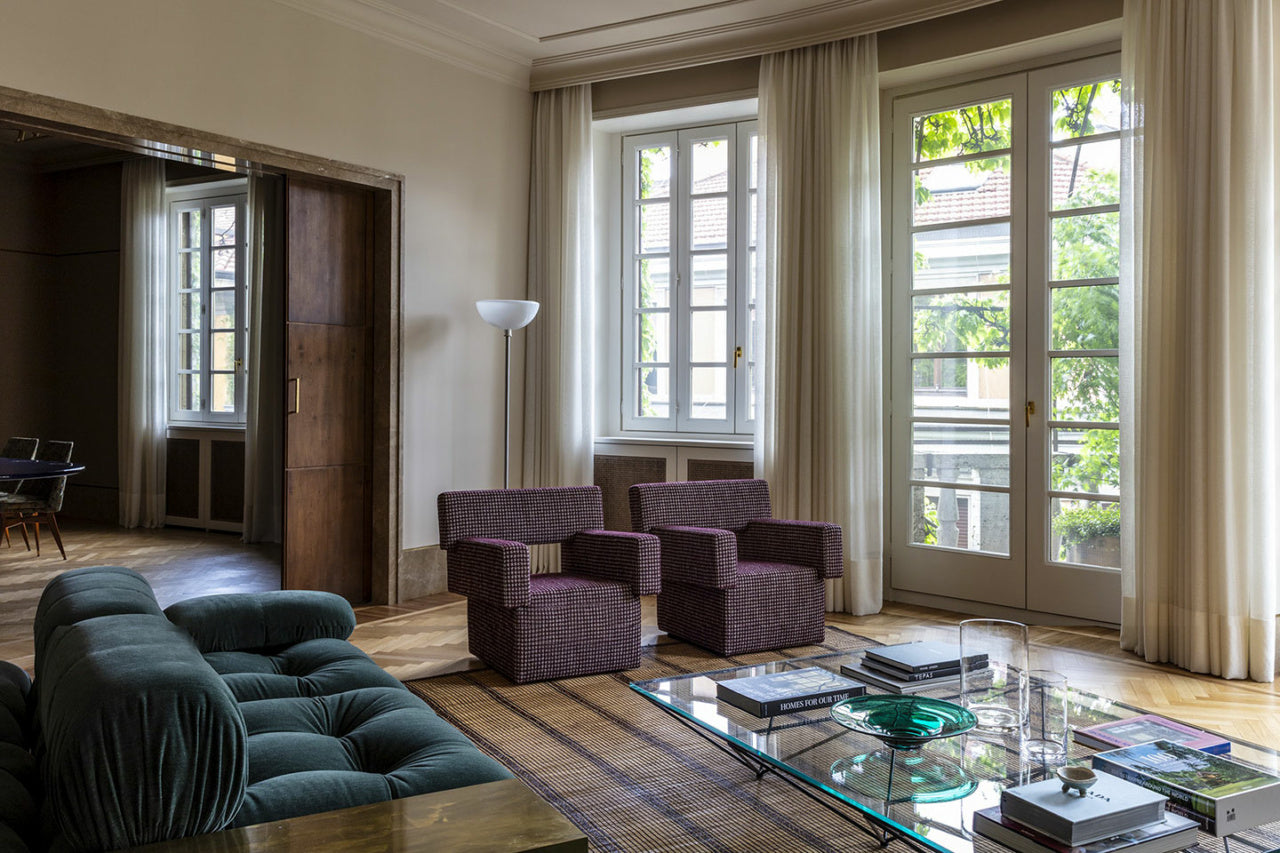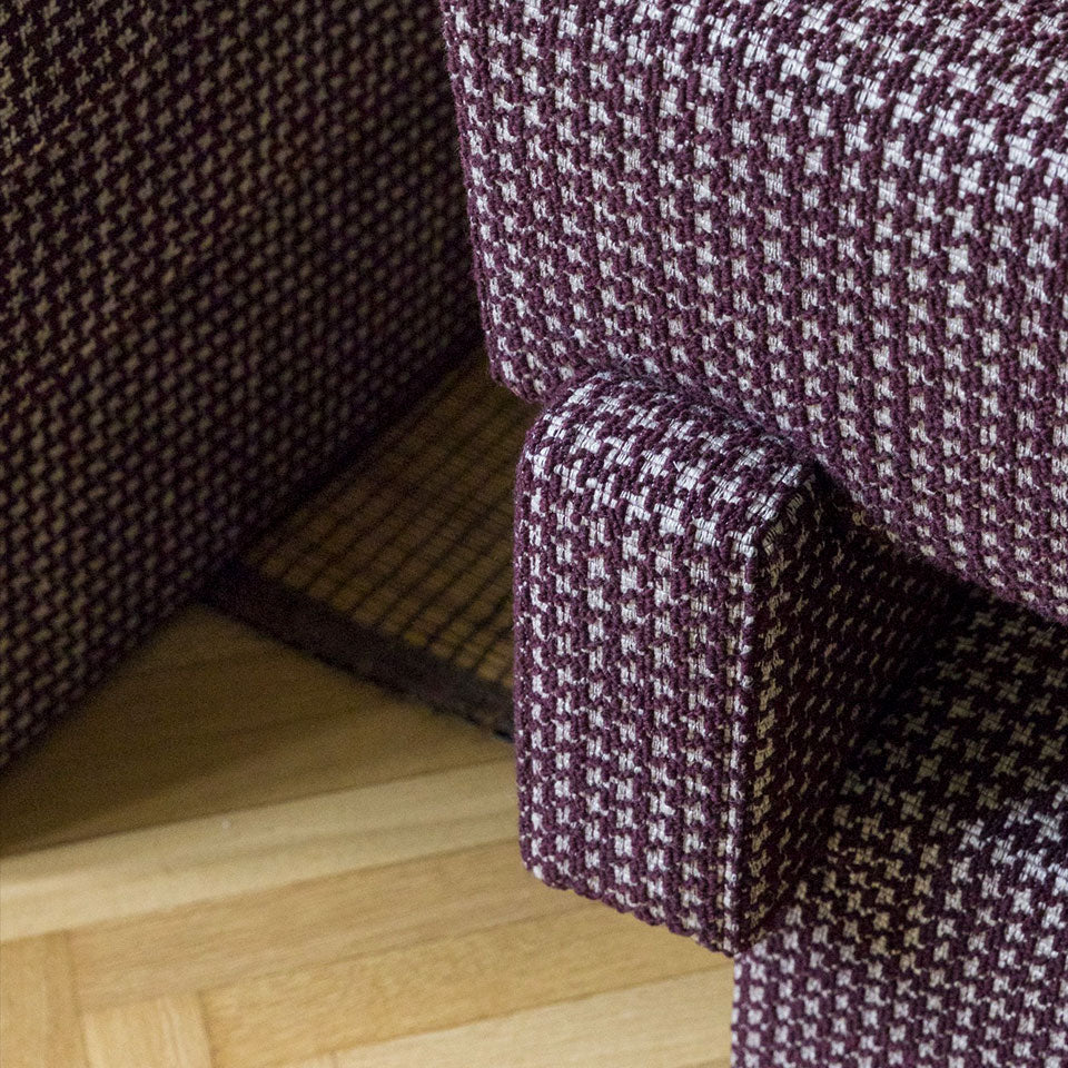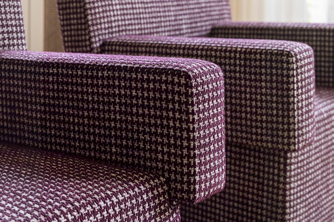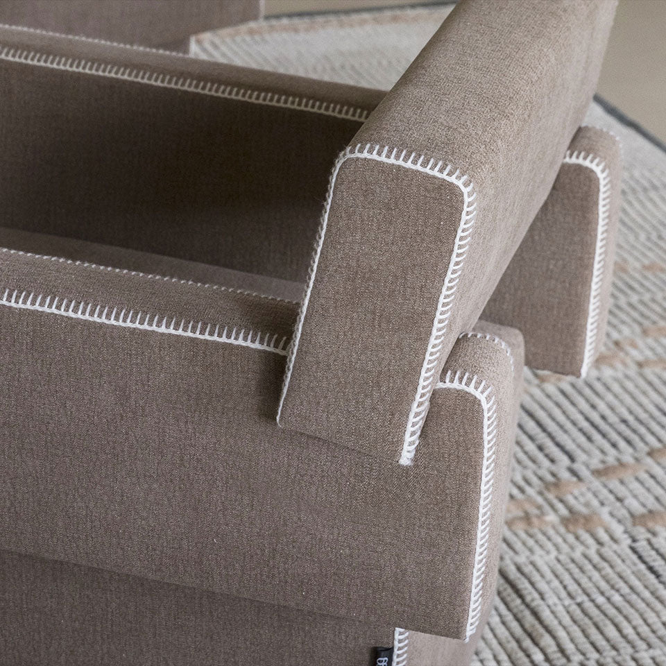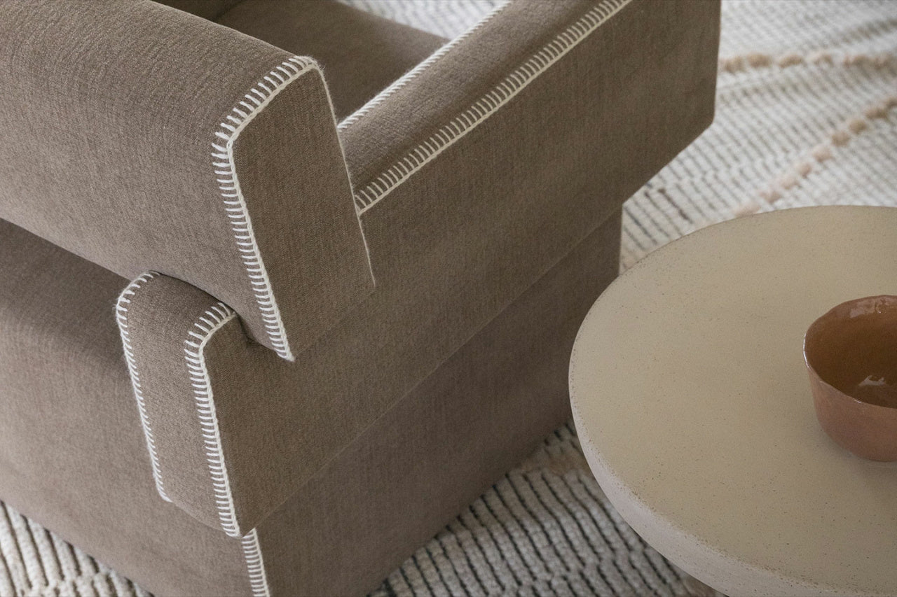 Padded armchair with non-removable cover, versatile and timeless, composed of simple and primary volumes with rigorous proportions, connected by a play of joints and overlaps in balance between form and function. On request with punto cavallo stitching.