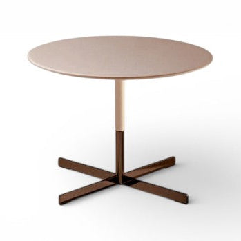 Defined by a sculptural four-arm steel base, Bob supports a circular top that enhances its harmonious and well-proportioned silhouette. The contrast between the soft leather surfaces and the solid metal structure gives the table a distinctive, contemporary character.