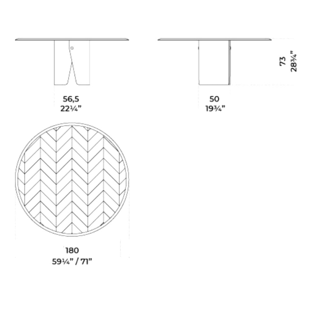 Manto is a table designed by Pietro Russo for Gallotti & Radice, distinguished by its bold presence and mesmerizing visual appeal. The table features a Frisé-finished wooden top with an elegant herringbone inlay, creating a refined and decorative surface. Its curved base embraces the central cylinder, secured by a satin brass button that enhances the sculptural quality of the piece, almost like a cloak wrapped around it. For added functionality and charm, a Lazy Susan tray can be integrated, offered with the same inlaid finish as the tabletop.