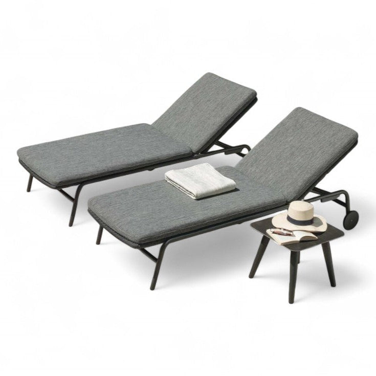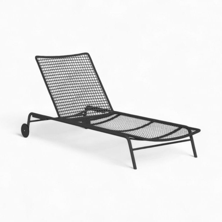 The Moon sun lounger is designed for pure outdoor relaxation, featuring a reclining system with a stainless steel rack that allows multiple comfort positions. Equipped with practical wheels, it can be easily moved and rotated to follow the sun throughout the day. Its clean and essential lines highlight the robust aluminium frame, creating a refined contrast with the black textilene seat that ensures durability and breathability in all weather conditions.