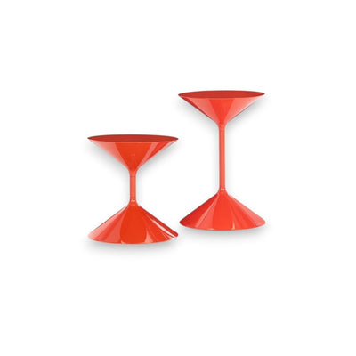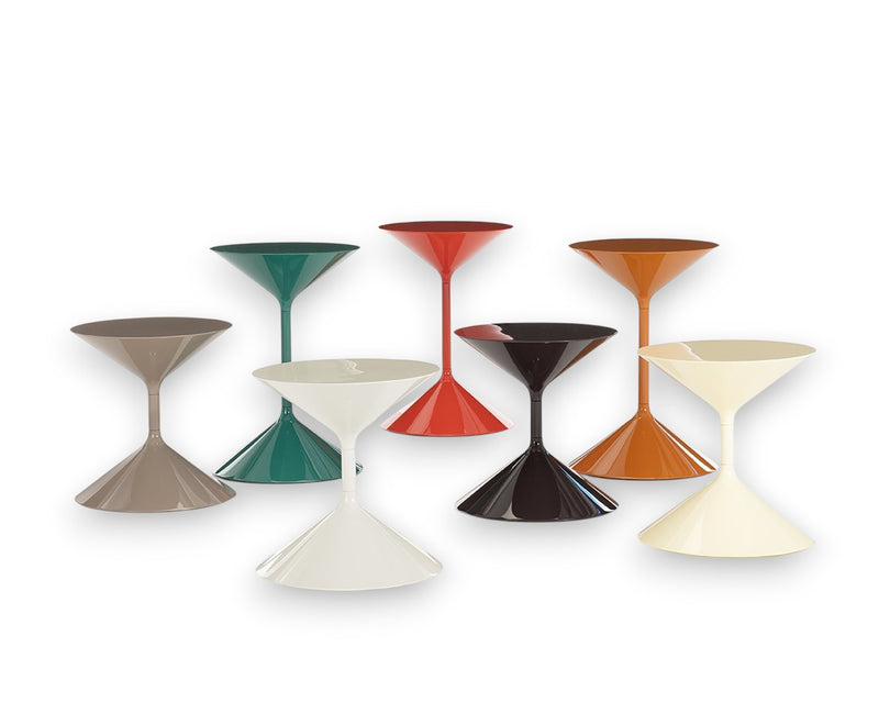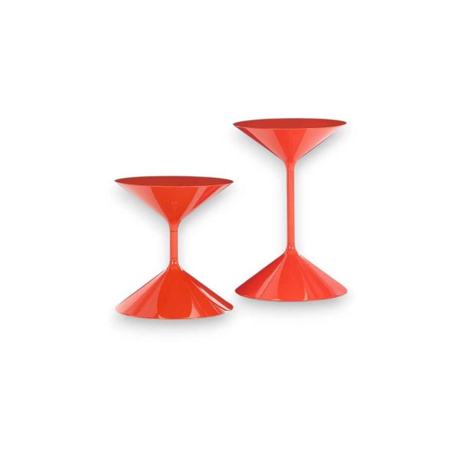 The Tempo coffee table, designed by Prospero Rasulo for Zanotta, is instantly recognizable by its bold hourglass silhouette. Crafted from two lacquered polyurethane cones joined by a central steel rod, the design achieves a striking visual balance between solidity and lightness.